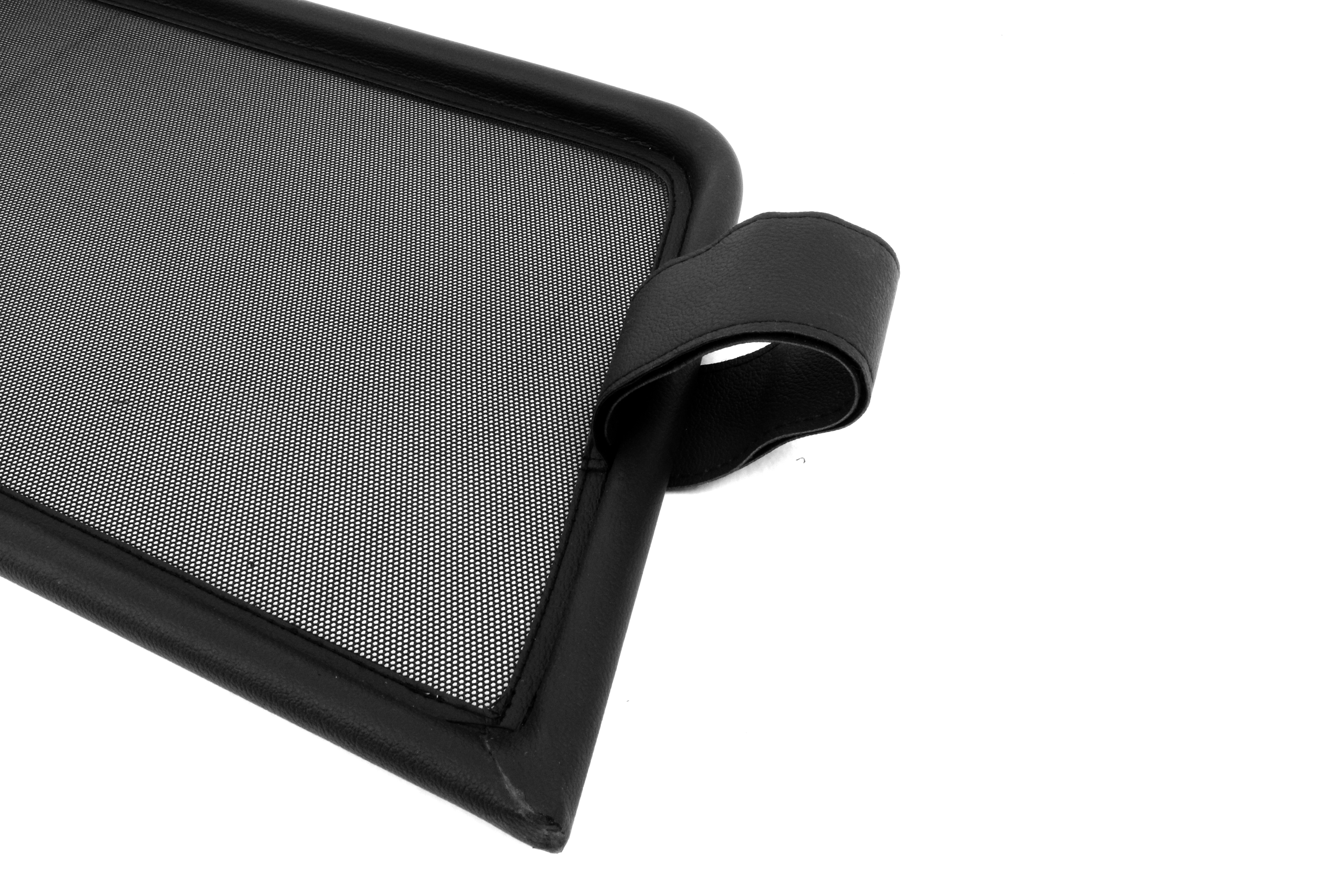 How does a wind deflector work?In its simplest form it is a mesh covered steel frame fixed behind the drivers seats, preventing the air swirling in the car every convertible driver knows. The deflector frames are made from high-grade steel tubes, bowed in car specific form and size, accurately welded and covered with weatherproof artificial leather with high-quality seams. A high-quality nylon-polyester blended fabric mesh is used as clothing, characterised by highest tensile strength and UV-resistance. Mesh, respectively frame systems can be mounted with the installation kits even by laymen within a few minutes!