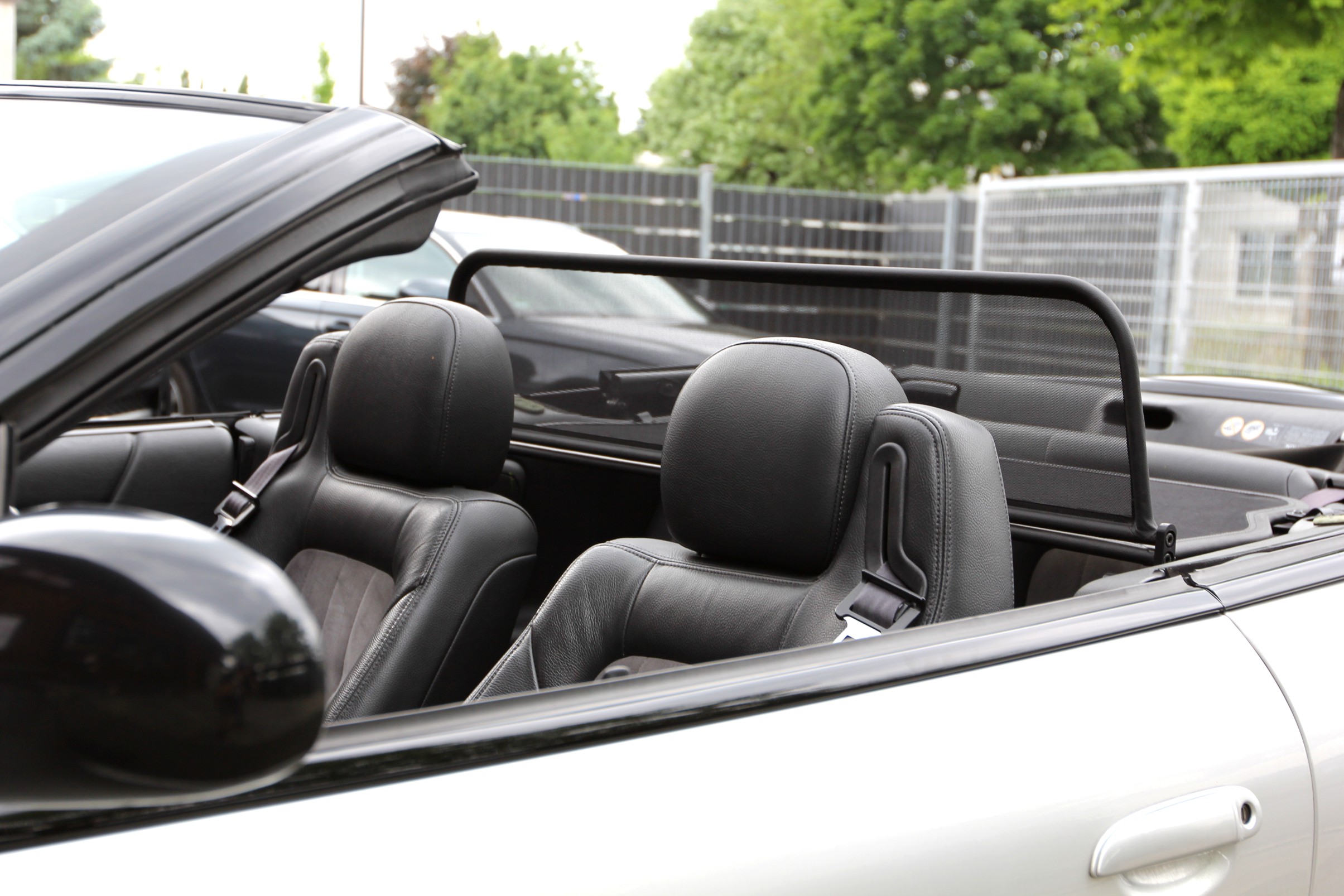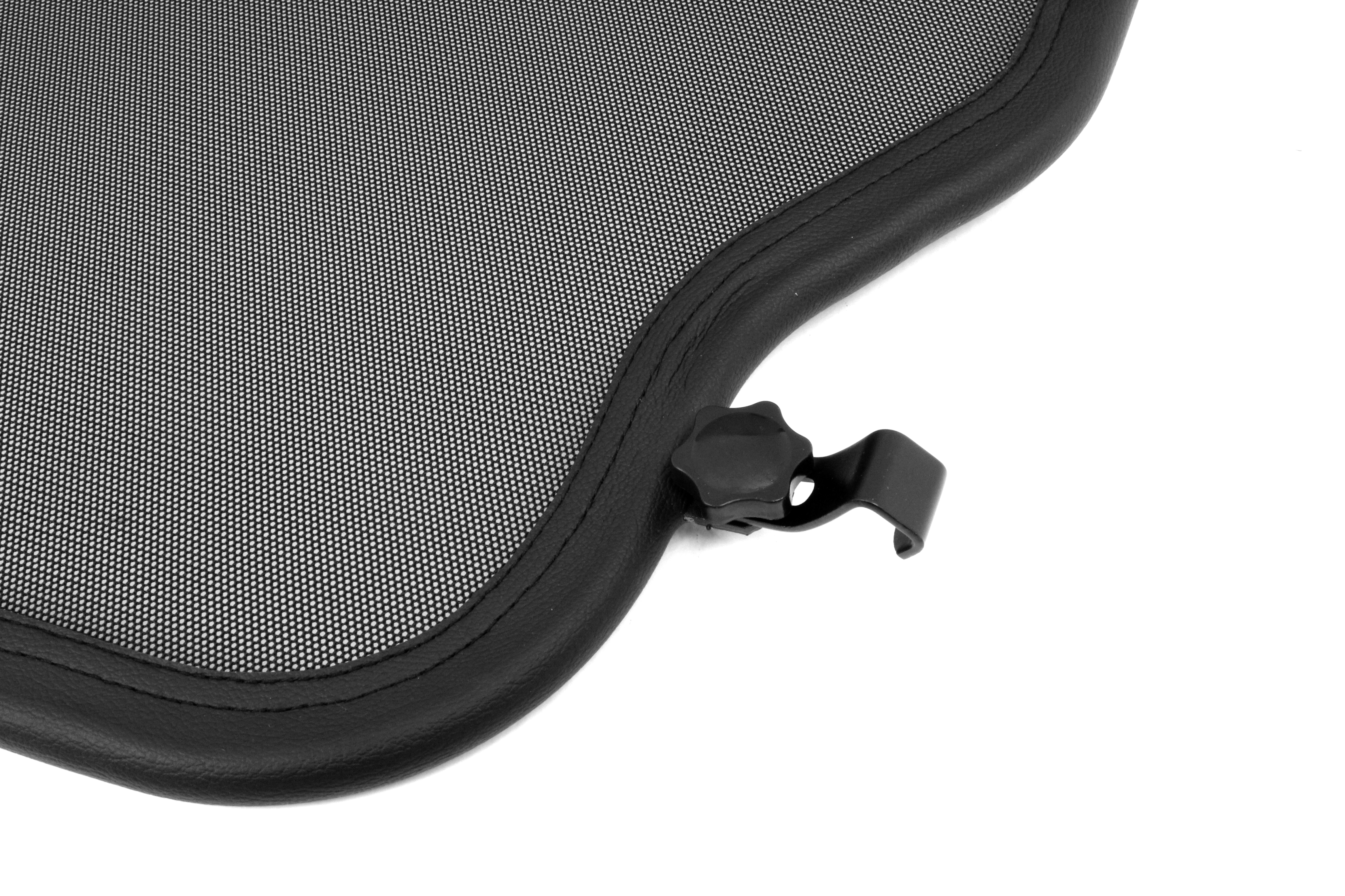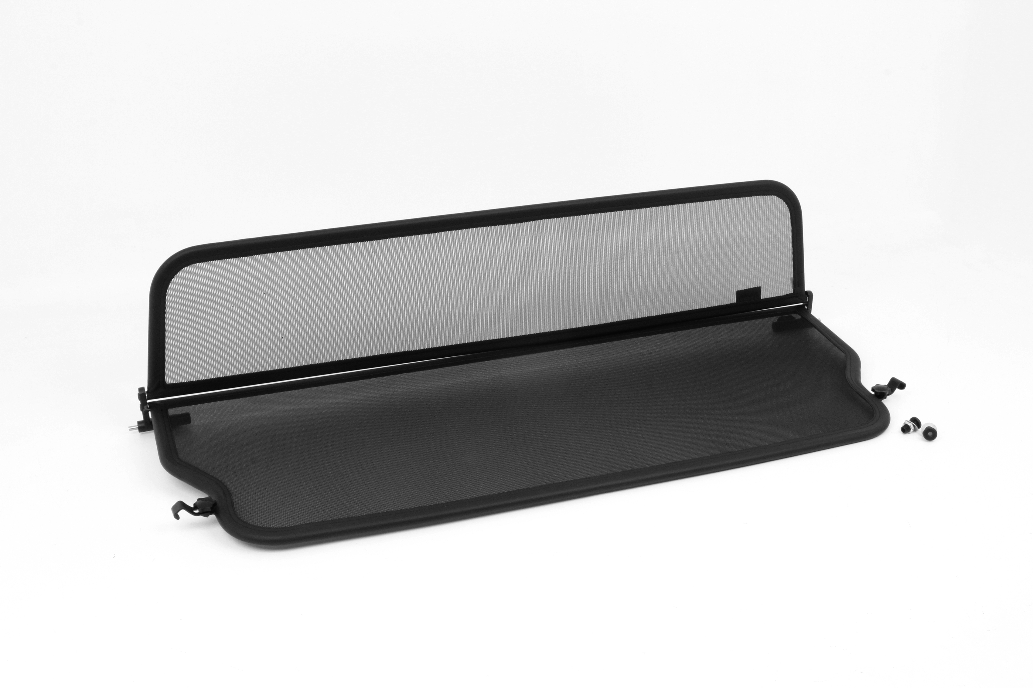 How does a wind deflector work?In its simplest form it is a mesh covered steel frame fixed behind the drivers seats, preventing the air swirling in the car every convertible driver knows. The deflector frames are made from high-grade steel tubes, bowed in car specific form and size, accurately welded and covered with weatherproof artificial leather with high-quality seams. A high-quality nylon-polyester blended fabric mesh is used as clothing, characterised by highest tensile strength and UV-resistance. Mesh, respectively frame systems can be mounted with the installation kits even by laymen within a few minutes!