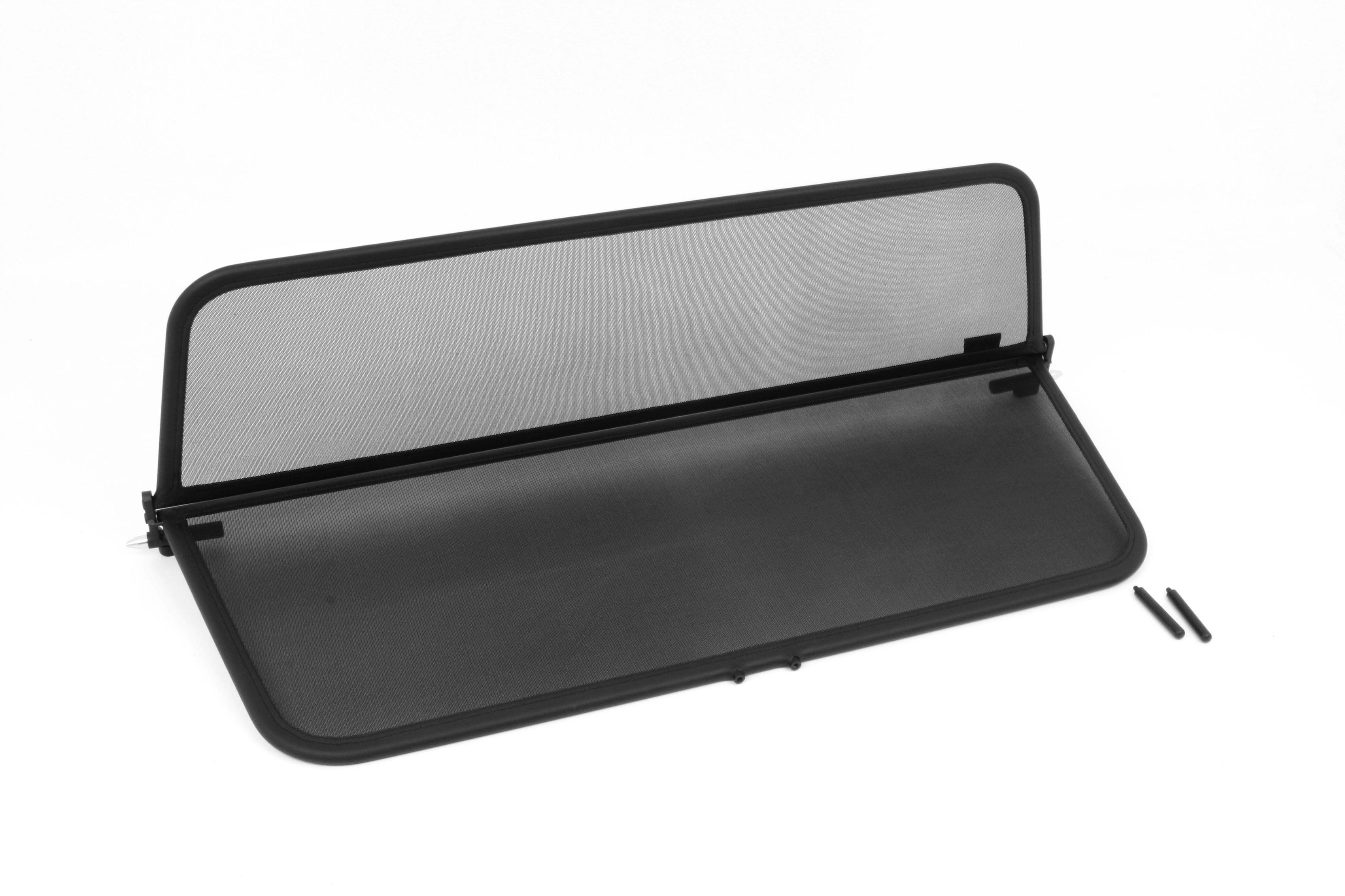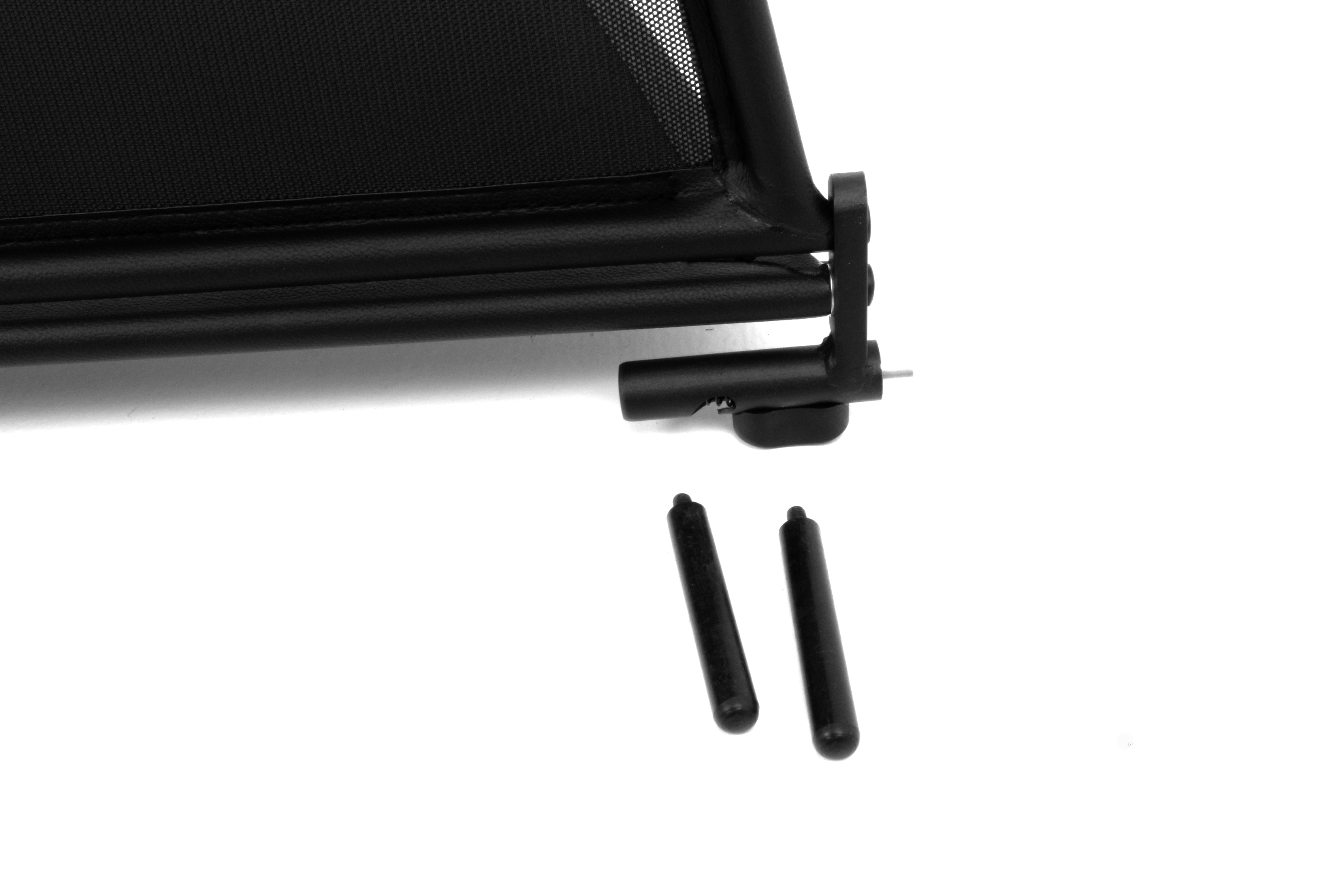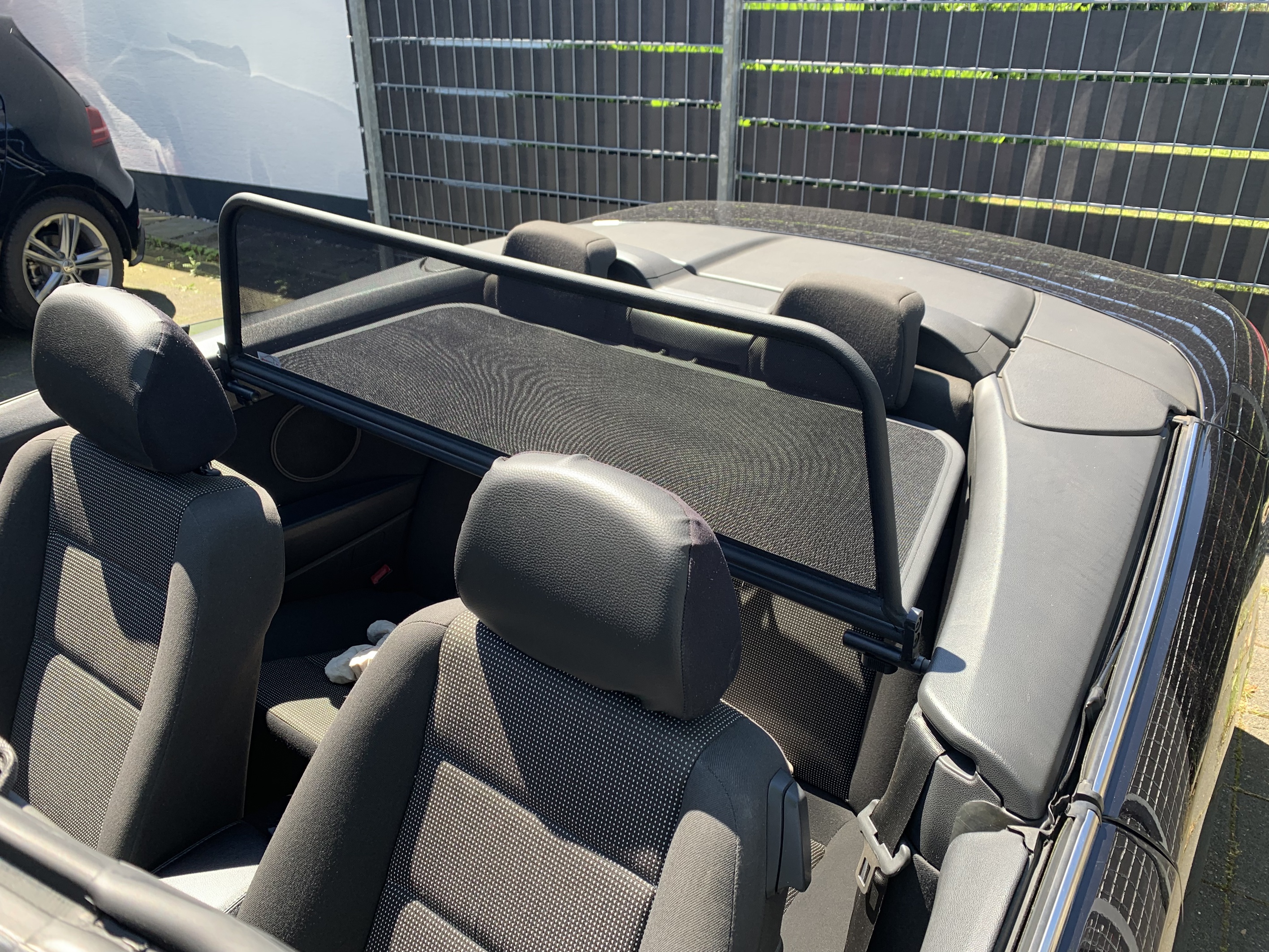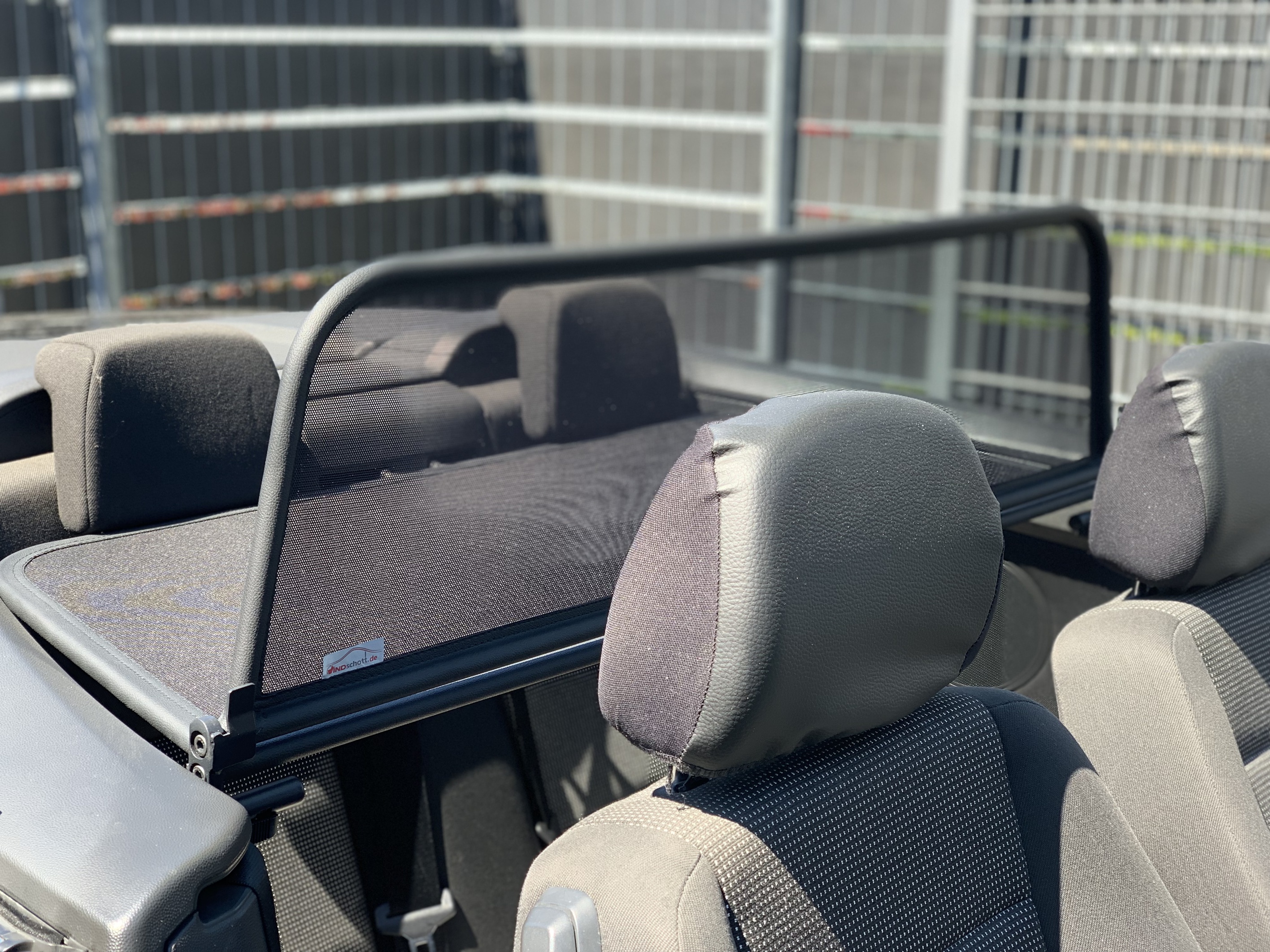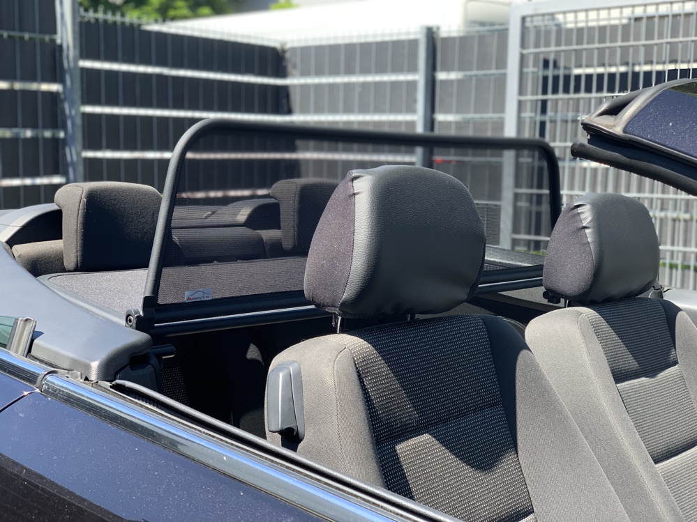 How does a wind deflector work?In its simplest form it is a mesh covered steel frame fixed behind the drivers seats, preventing the air swirling in the car every convertible driver knows. The deflector frames are made from high-grade steel tubes, bowed in car specific form and size, accurately welded and covered with weatherproof artificial leather with high-quality seams. A high-quality nylon-polyester blended fabric mesh is used as clothing, characterised by highest tensile strength and UV-resistance. Mesh, respectively frame systems can be mounted with the installation kits even by laymen within a few minutes!