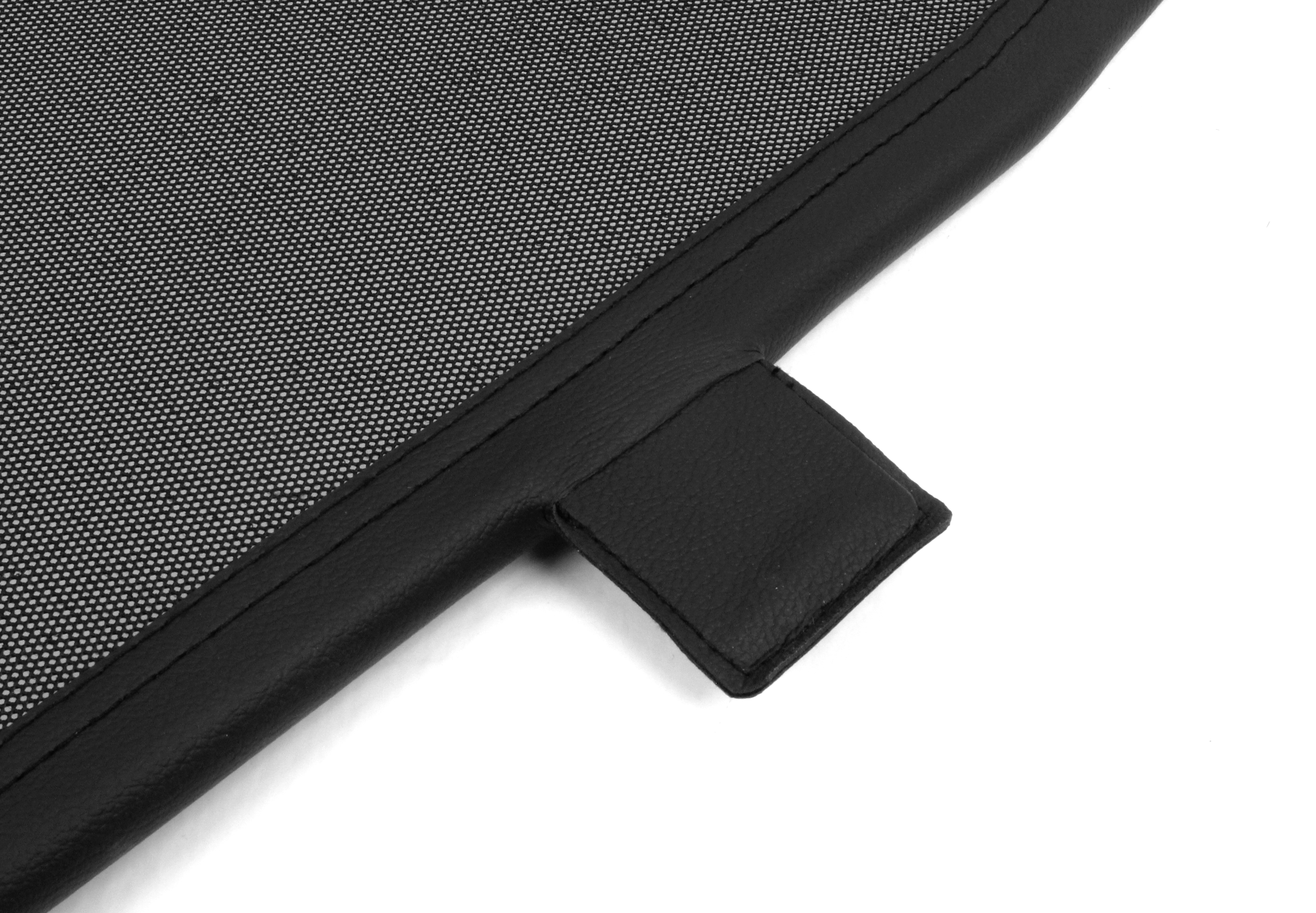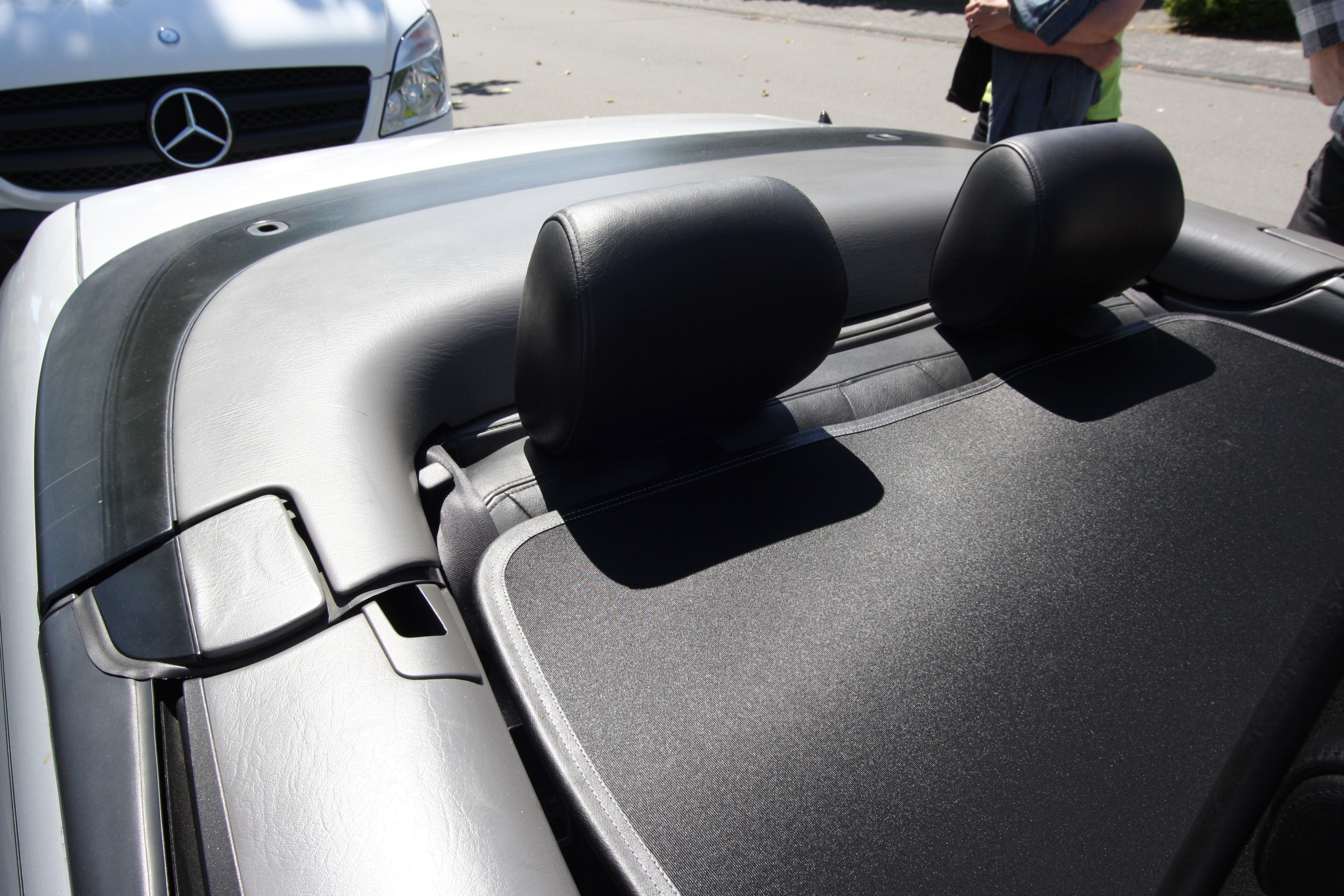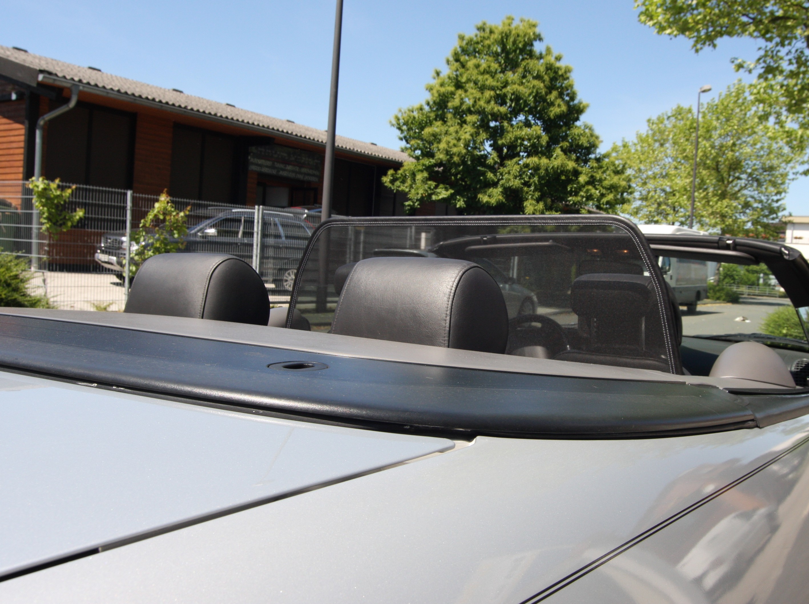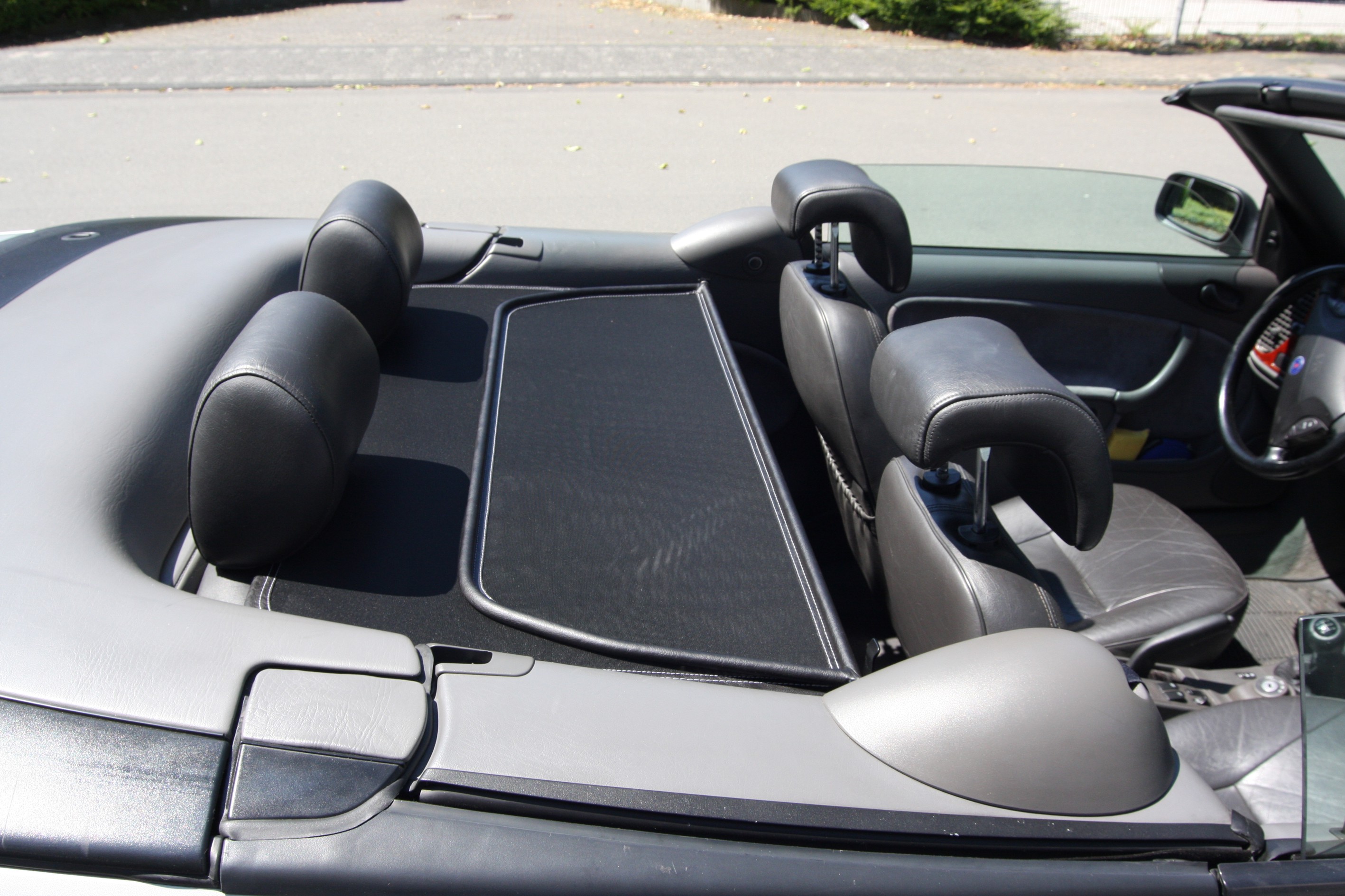 How does a wind deflector work?In its simplest form it is a mesh covered steel frame fixed behind the drivers seats, preventing the air swirling in the car every convertible driver knows. The deflector frames are made from high-grade steel tubes, bowed in car specific form and size, accurately welded and covered with weatherproof artificial leather with high-quality seams. A high-quality nylon-polyester blended fabric mesh is used as clothing, characterised by highest tensile strength and UV-resistance. Mesh, respectively frame systems can be mounted with the installation kits even by laymen within a few minutes!