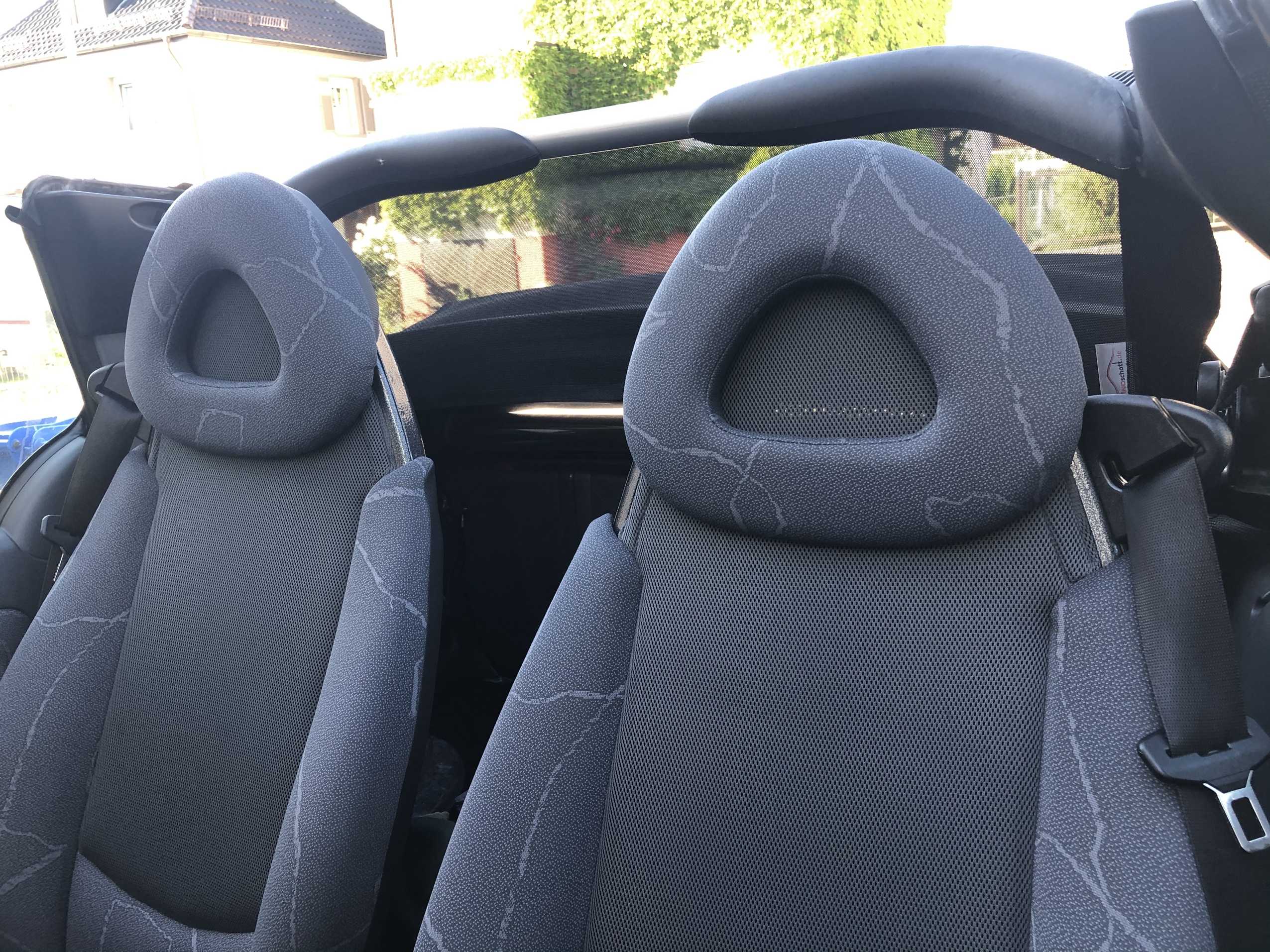 How does a wind deflector work?In its simplest form it is a mesh covered steel frame fixed behind the drivers seats, preventing the air swirling in the car every convertible driver knows. The deflector frames are made from high-grade steel tubes, bowed in car specific form and size, accurately welded and covered with weatherproof artificial leather with high-quality seams. A high-quality nylon-polyester blended fabric mesh is used as clothing, characterised by highest tensile strength and UV-resistance. Mesh, respectively frame systems can be mounted with the installation kits even by laymen within a few minutes!