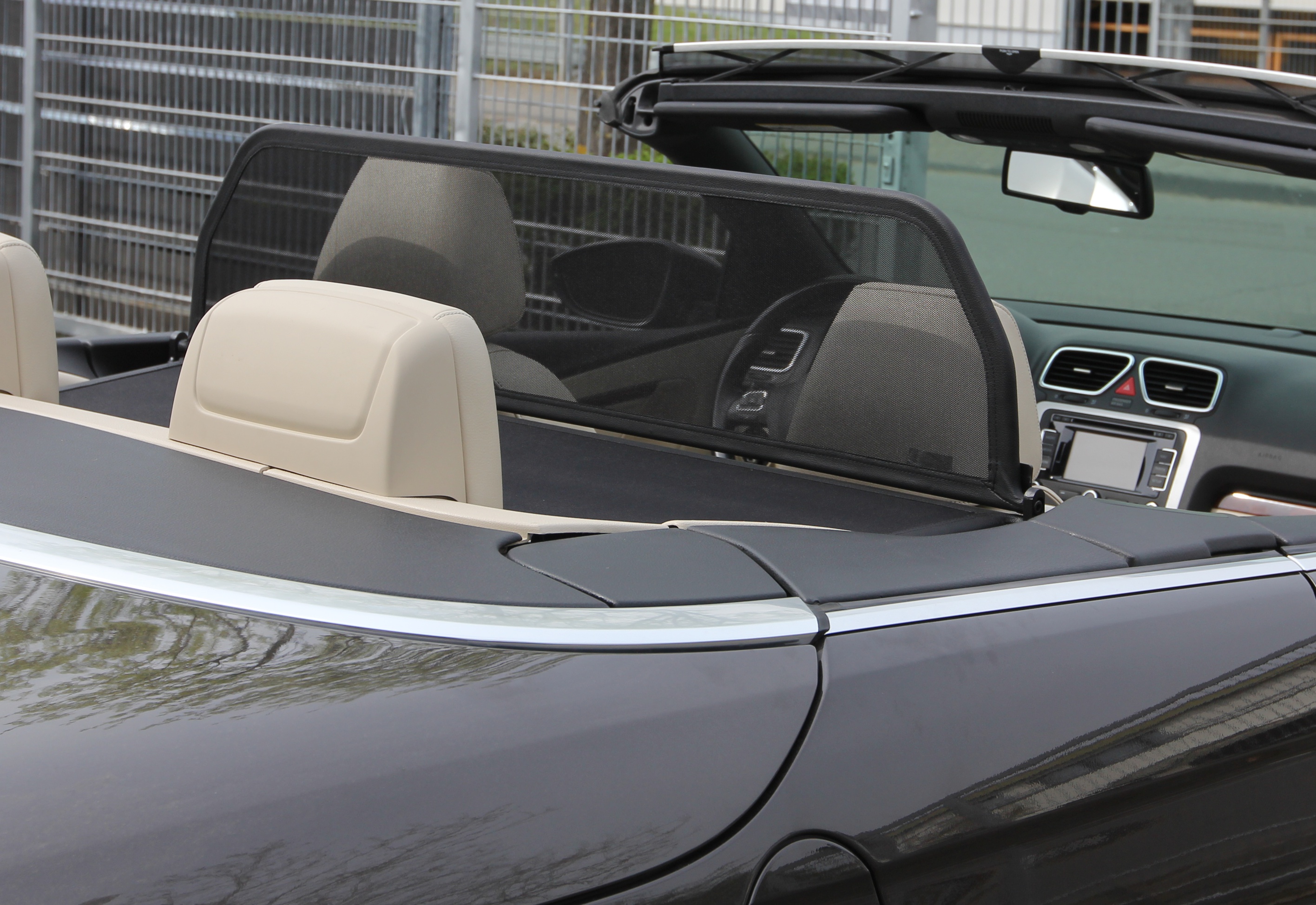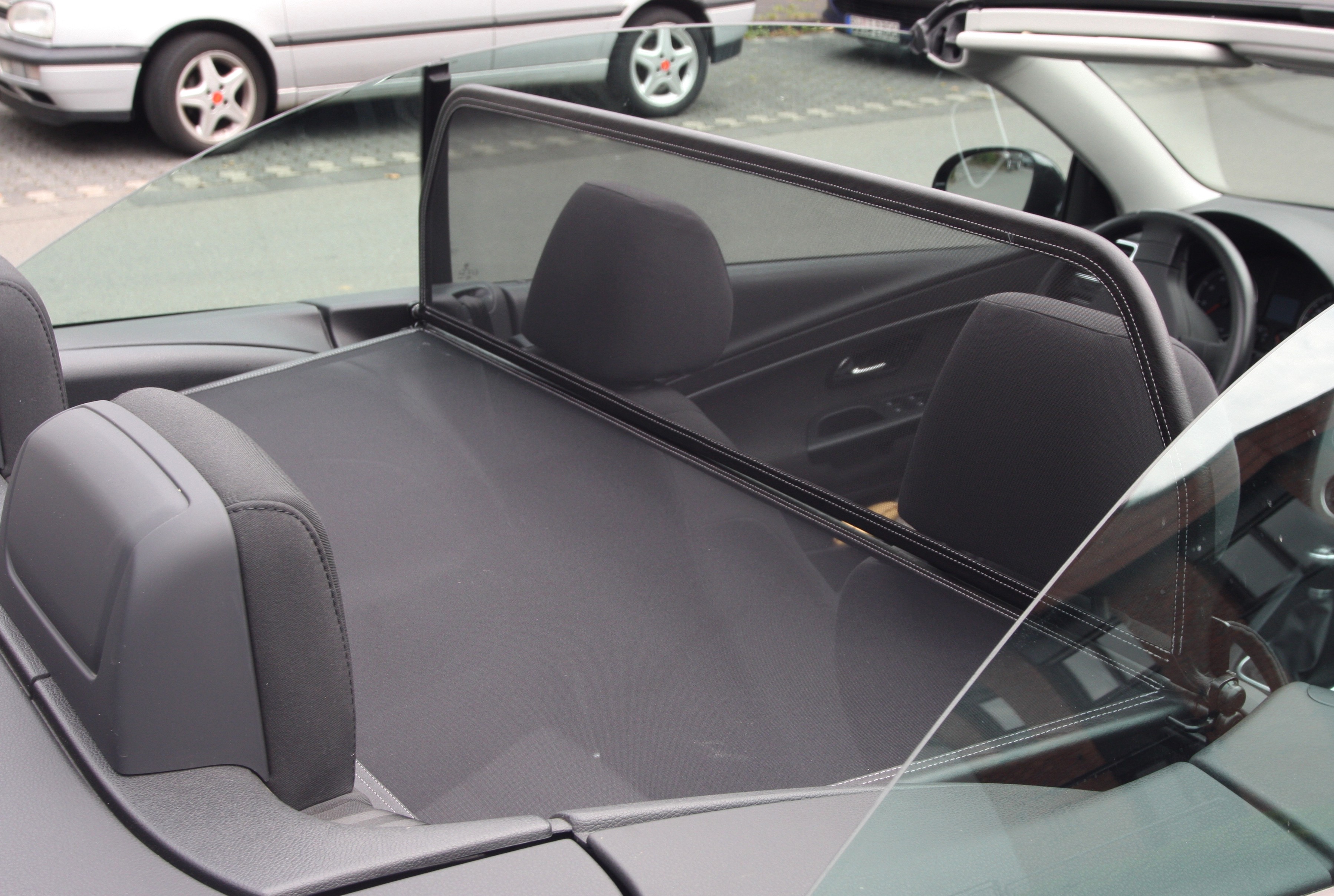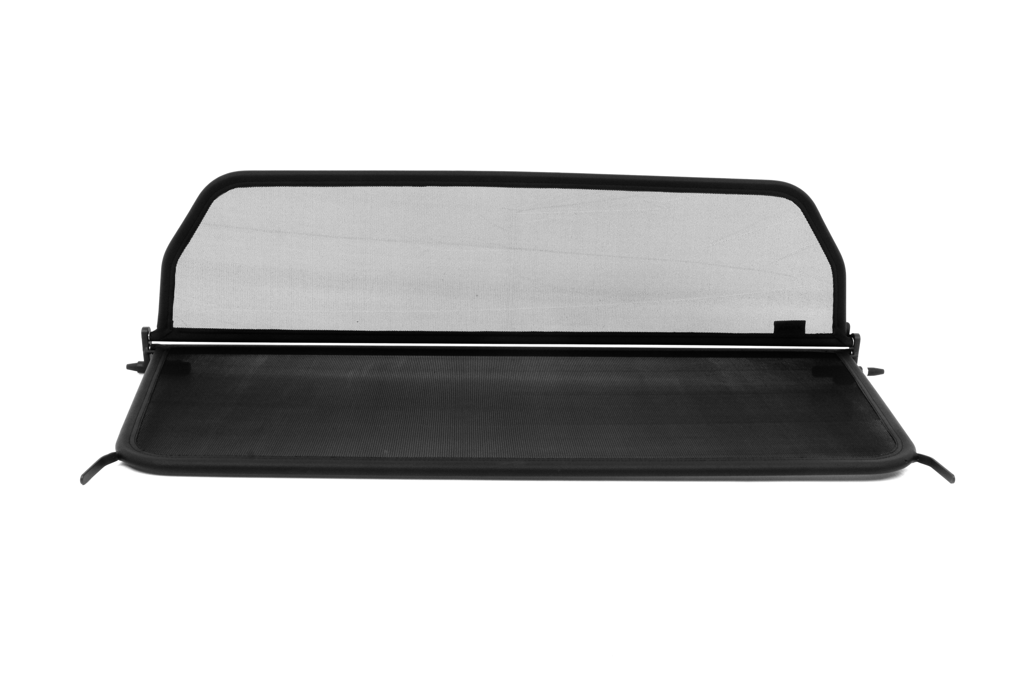 ¿Pero qué es exactamente un deflector de viento? Un deflector de viento en la versión simple es un bastidor de tubos de acero forrado con red y montado detrás de la zona del conductor. Sirve para garantizar que las turbulencias del aire habituales en un descapotable se desvíen a través del interior del vehículo. Los bastidores de los deflectores de viento están hechos de tubos de acero de alta calidad, curvados según el grosor específico del modelo, soldados cuidadosamente y cosidos con cuero artificial muy resistente a la intemperie. Para la red utilizamos un tejido mixto de nylon-poliéster de alta calidad, que se distingue por su alta resistencia a la tracción y a los rayos UV. Incluso el personal no especializado puede montar en pocos minutos el conjunto de red y del bastidor con sus accesorios y piezas de sujeción correspondientes.
