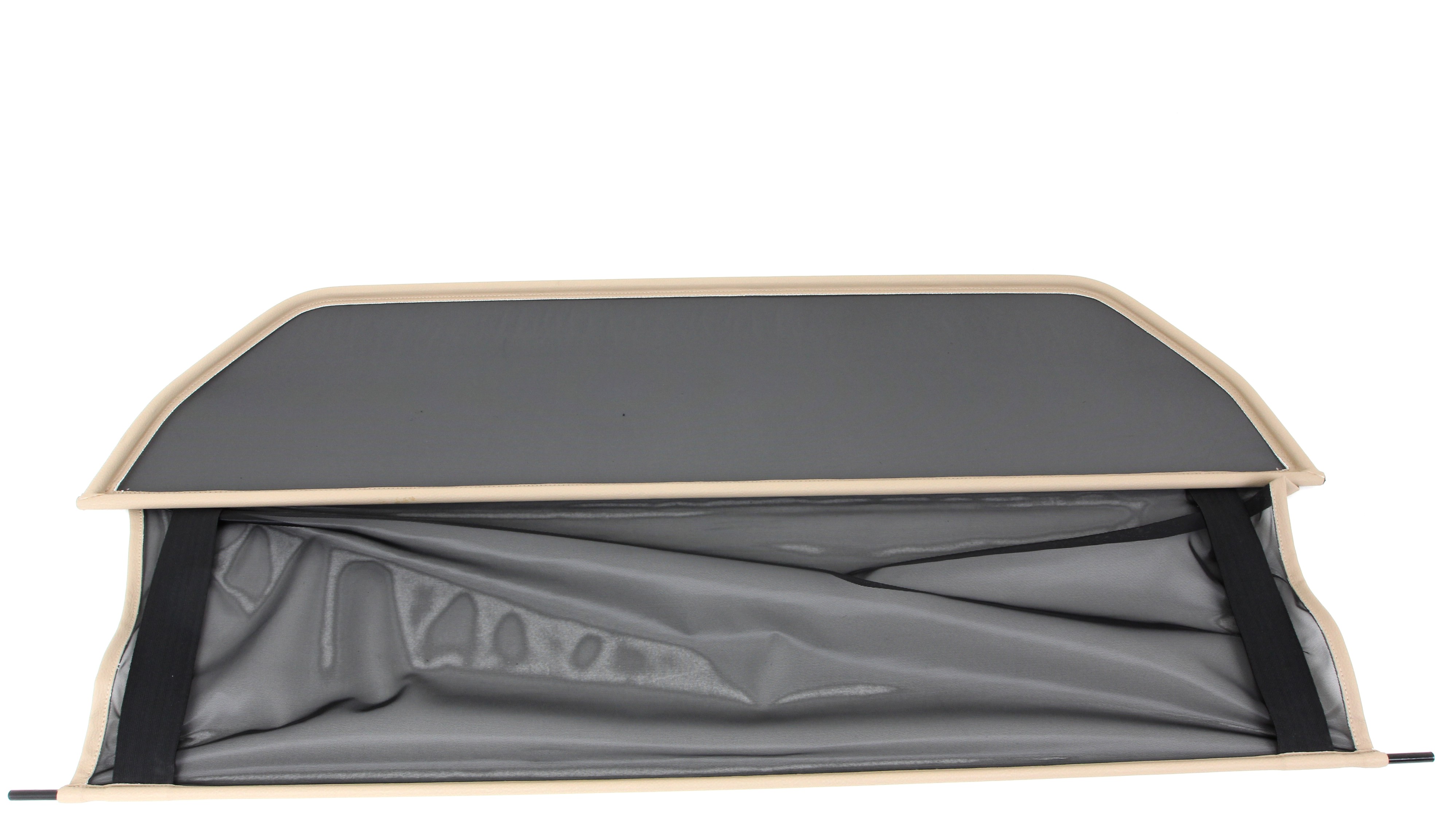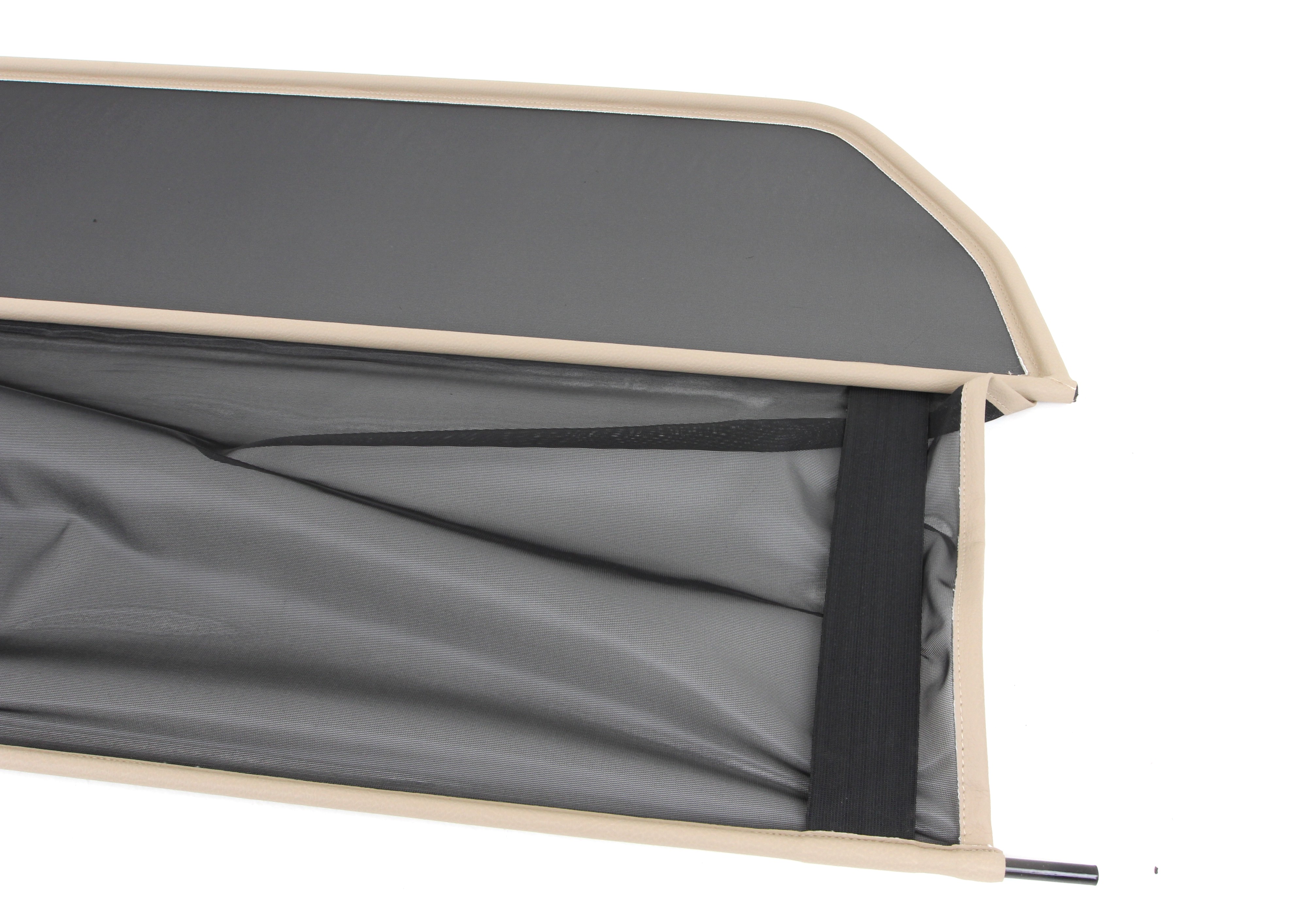 ¿Pero qué es exactamente un deflector de viento? Un deflector de viento en la versión simple es un bastidor de tubos de acero forrado con red y montado detrás de la zona del conductor. Sirve para garantizar que las turbulencias del aire habituales en un descapotable se desvíen a través del interior del vehículo. Los bastidores de los deflectores de viento están hechos de tubos de acero de alta calidad, curvados según el grosor específico del modelo, soldados cuidadosamente y cosidos con cuero artificial muy resistente a la intemperie. Para la red utilizamos un tejido mixto de nylon-poliéster de alta calidad, que se distingue por su alta resistencia a la tracción y a los rayos UV. Incluso el personal no especializado puede montar en pocos minutos el conjunto de red y del bastidor con sus accesorios y piezas de sujeción correspondientes.
