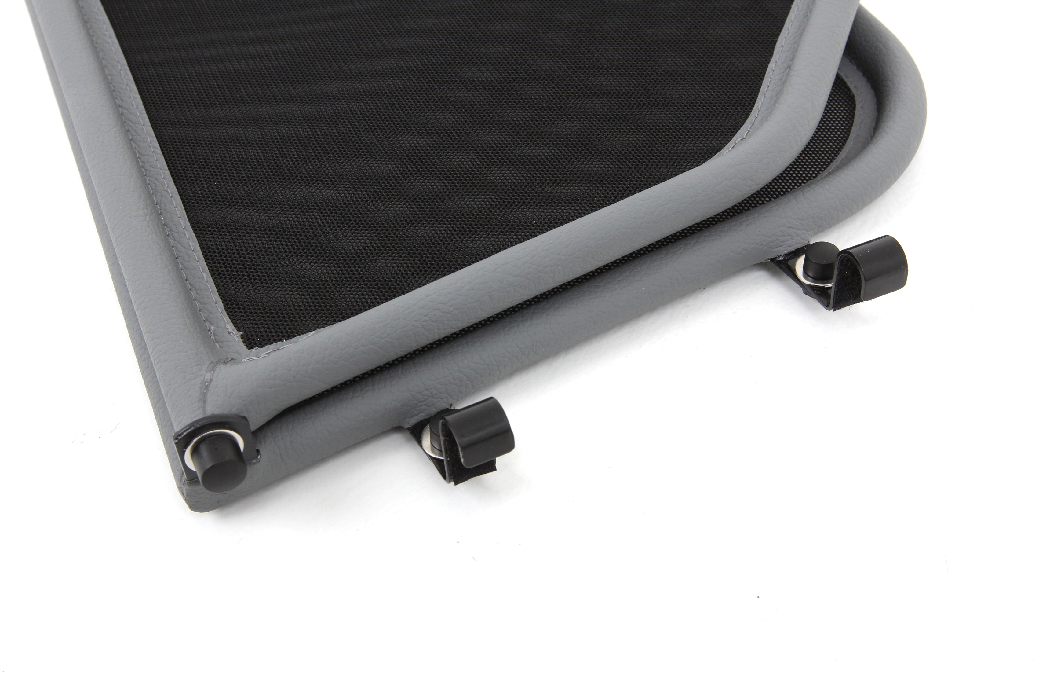 Mais en fait, un filet pare-vent, qu’est-ce que c’est exactement ? Un filet pare-vent est constitué, dans sa forme la plus simple, d’un filet tendu sur un cadre de tubes d’acier monté derrière le poste de conduite lui-même. Il assure que les tourbillons d’air, qui sont normalement produits lorsque l’on roule dans un cabriolet décapoté, soient déviés en ne pénètrent pas dans l’habitacle. Les cadres des pare-vents sont constitués de tubes d’acier haut de gamme, pliés pour correspondre aux besoins du modèle, soudés avec le plus grand soin et autour desquels un similicuir résistant aux intempéries est cousu. Pour le filet, nous utilisons un mélange de nylon et de polyester de grande qualité, caractérisé par sa capacité de tension et par sa résistance aux UV. Le filet comme le cadre, avec les pièces de montage et de tension correspondantes, permettent même à l’amateur de monter le pare-vent le plus souvent en quelques minutes seulement.