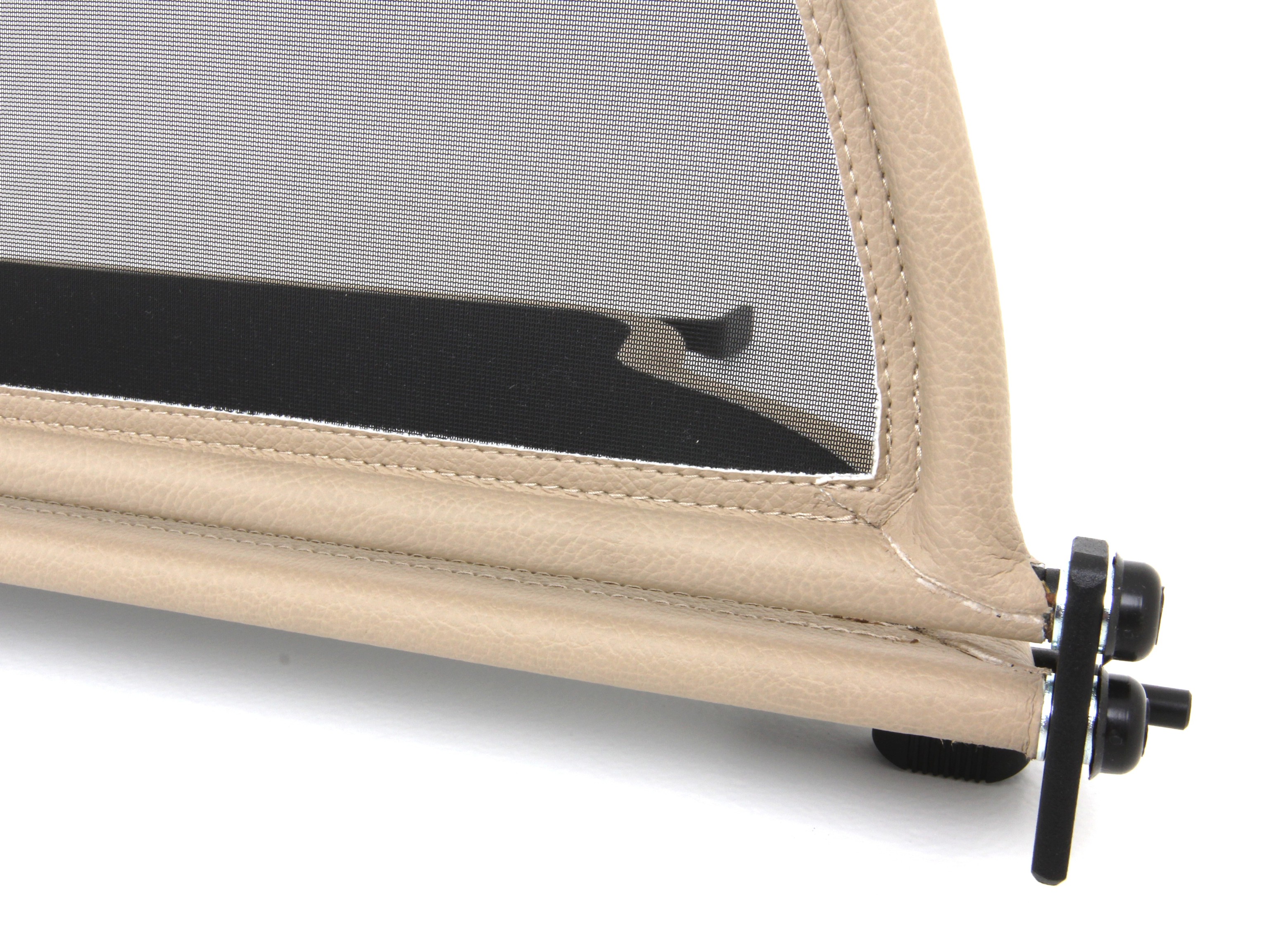 Mais en fait, un filet pare-vent, qu’est-ce que c’est exactement ? Un filet pare-vent est constitué, dans sa forme la plus simple, d’un filet tendu sur un cadre de tubes d’acier monté derrière le poste de conduite lui-même. Il assure que les tourbillons d’air, qui sont normalement produits lorsque l’on roule dans un cabriolet décapoté, soient déviés en ne pénètrent pas dans l’habitacle. Les cadres des pare-vents sont constitués de tubes d’acier haut de gamme, pliés pour correspondre aux besoins du modèle, soudés avec le plus grand soin et autour desquels un similicuir résistant aux intempéries est cousu. Pour le filet, nous utilisons un mélange de nylon et de polyester de grande qualité, caractérisé par sa capacité de tension et par sa résistance aux UV. Le filet comme le cadre, avec les pièces de montage et de tension correspondantes, permettent même à l’amateur de monter le pare-vent le plus souvent en quelques minutes seulement.
