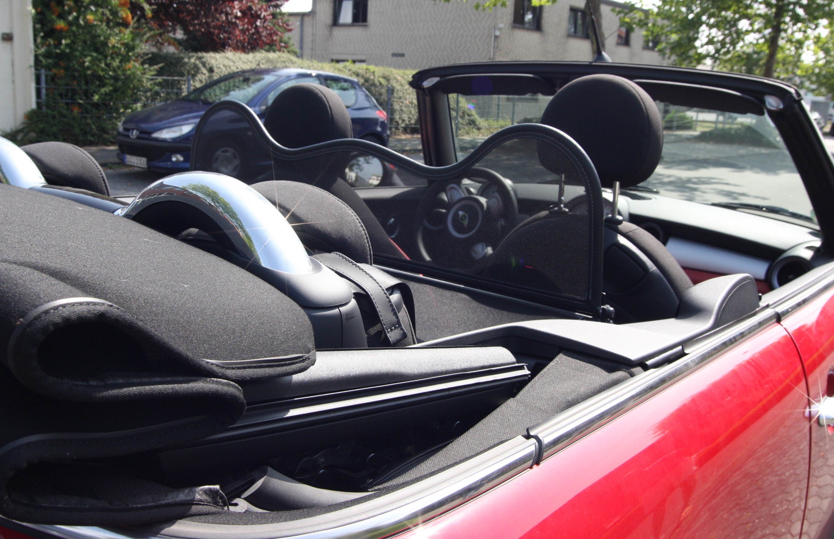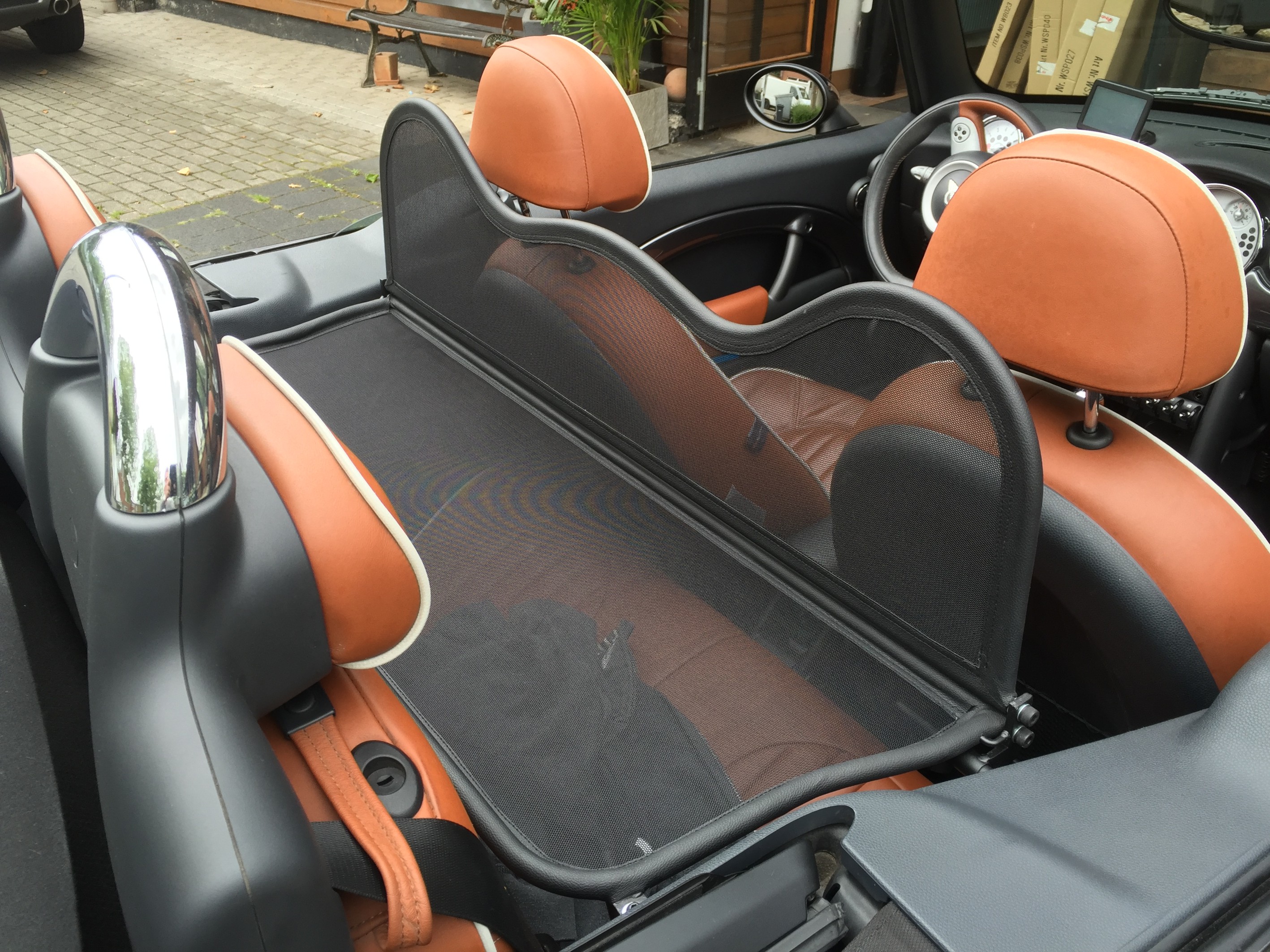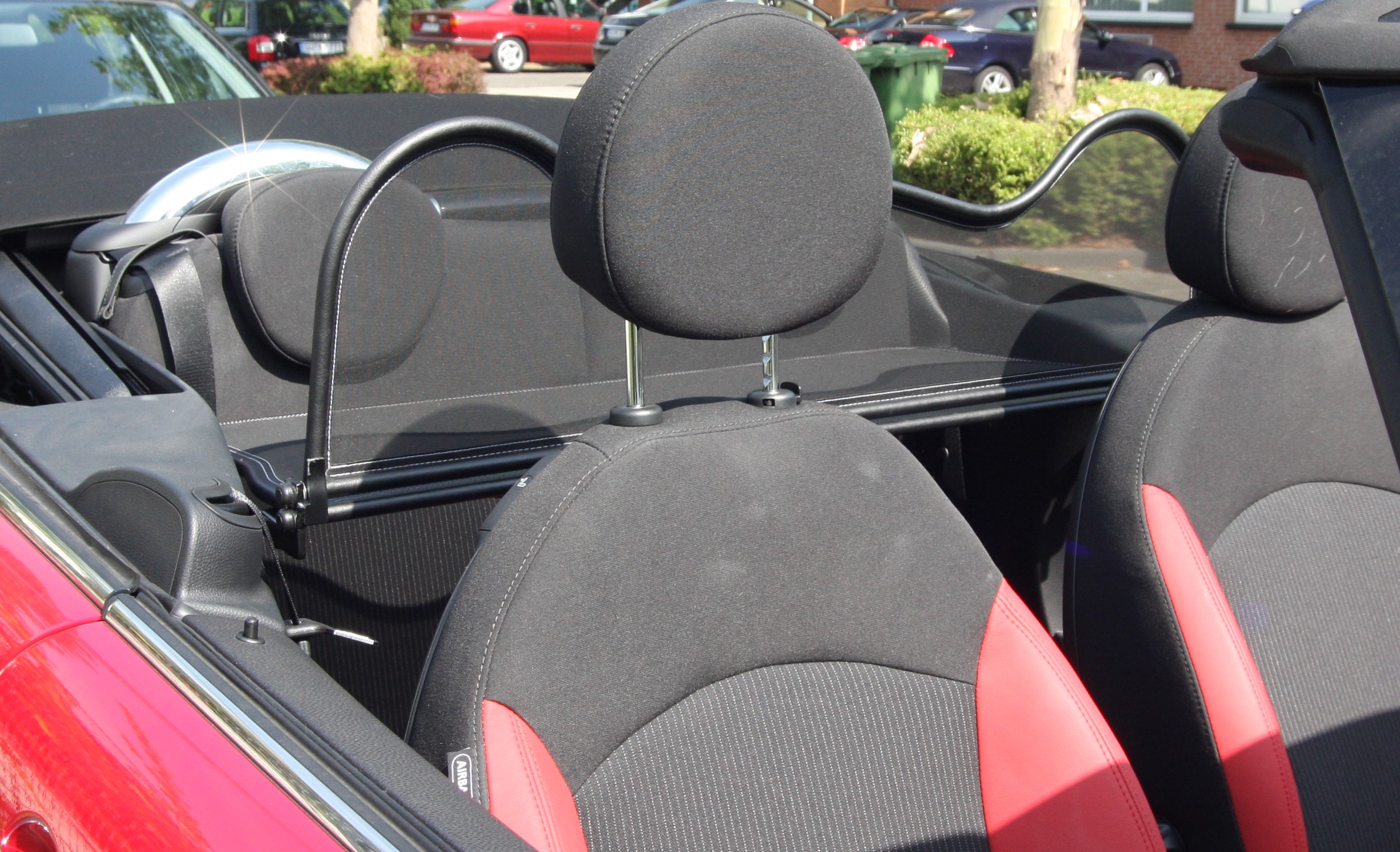 Wat doet een windscherm precies? Een windscherm in de eenvoudige versie is een stalen buisframe met net, gemonteerd achter de eigenlijke cabine, dat ervoor zorgt dat de gebruikelijke luchtwervelingen van een cabriolet worden omgeleid over het interieur van het voertuig. De frames van de windschermen zijn gemaakt van hoogwaardige stalen buizen, gebogen in de modelspecifieke dikte, netjes gelast en in weerbestendig kunstleer genaaid. Voor het netwerk gebruiken we een hoogwaardig nylon-polyester gemengd weefsel, dat zich onderscheidt door zijn hoge treksterkte en UV-bestendigheid. De net- of frameconstructie met de juiste bevestigingen en onderdelen, kan ook door een leek binnen enkele minuten worden gemonteerd.
