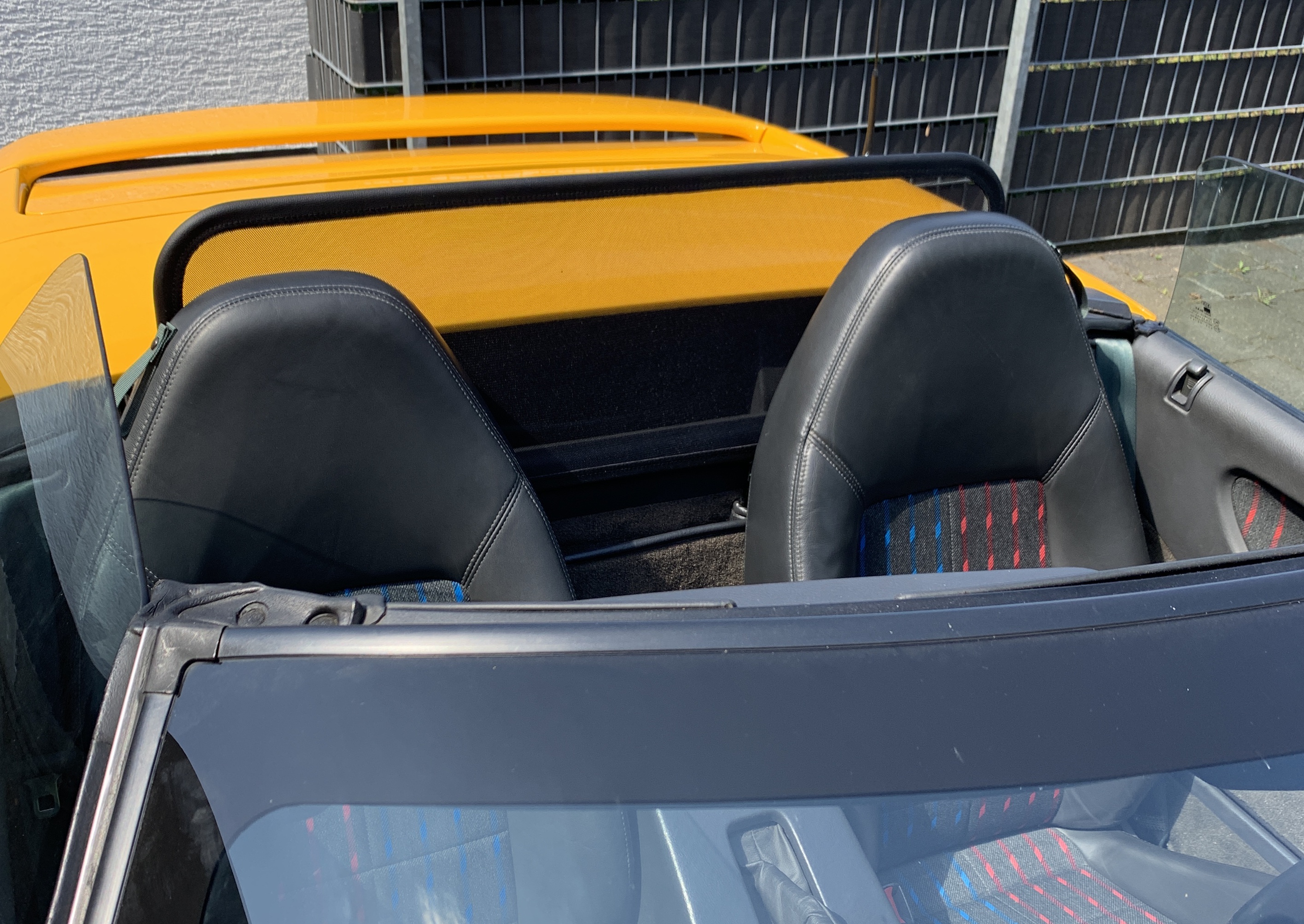 Wat doet een windscherm precies? Een windscherm in de eenvoudige versie is een stalen buisframe met net, gemonteerd achter de eigenlijke cabine, dat ervoor zorgt dat de gebruikelijke luchtwervelingen van een cabriolet worden omgeleid over het interieur van het voertuig. De frames van de windschermen zijn gemaakt van hoogwaardige stalen buizen, gebogen in de modelspecifieke dikte, netjes gelast en in weerbestendig kunstleer genaaid. Voor het netwerk gebruiken we een hoogwaardig nylon-polyester gemengd weefsel, dat zich onderscheidt door zijn hoge treksterkte en UV-bestendigheid. De net- of frameconstructie met de juiste bevestigingen en onderdelen, kan ook door een leek binnen enkele minuten worden gemonteerd.