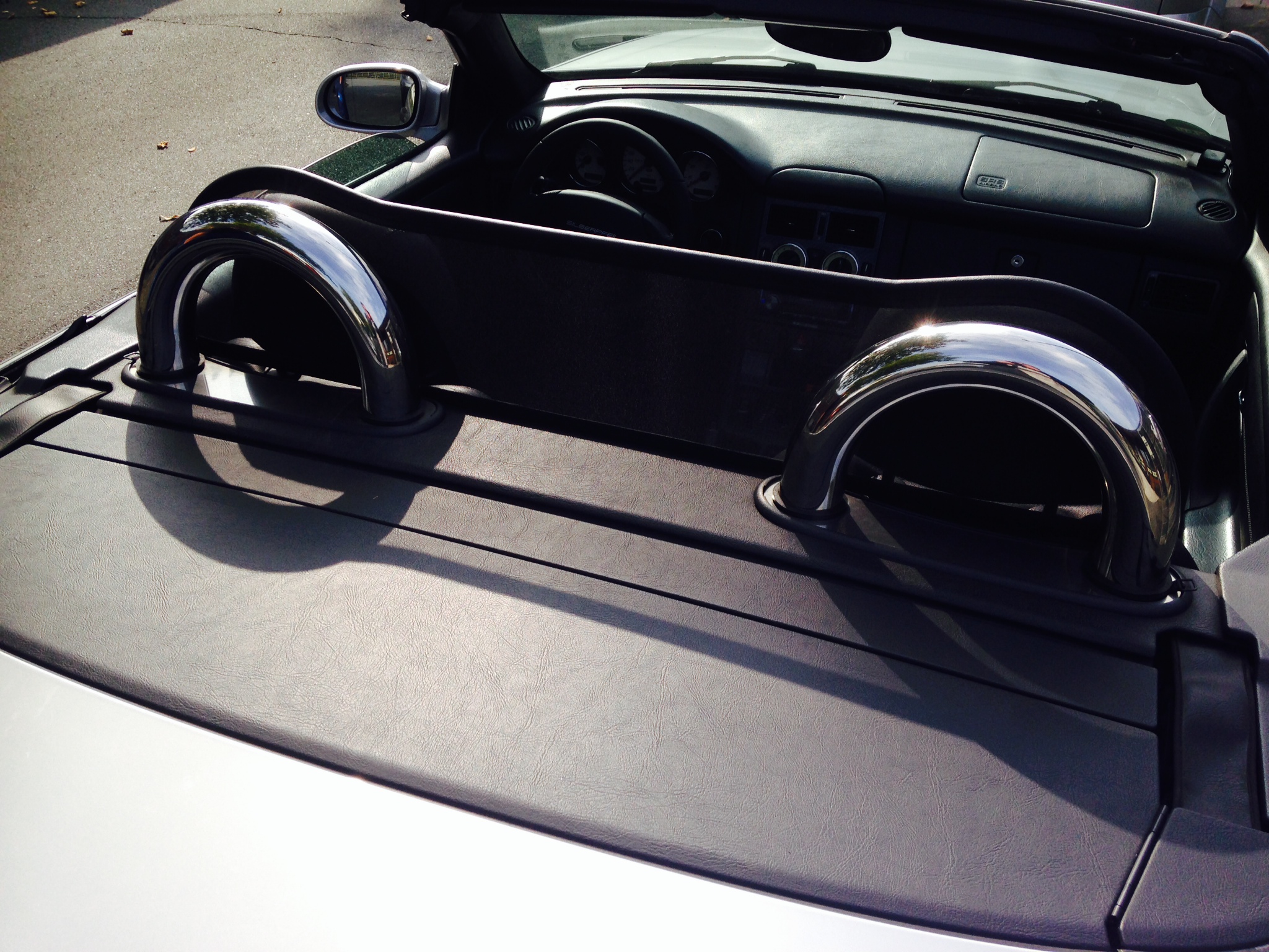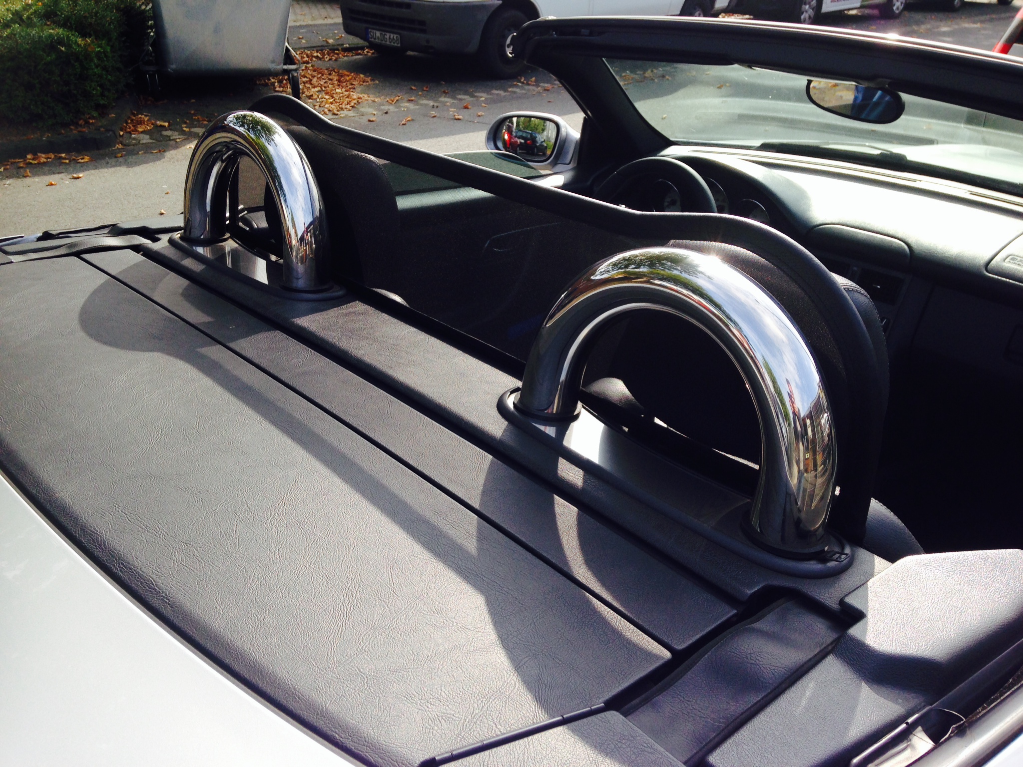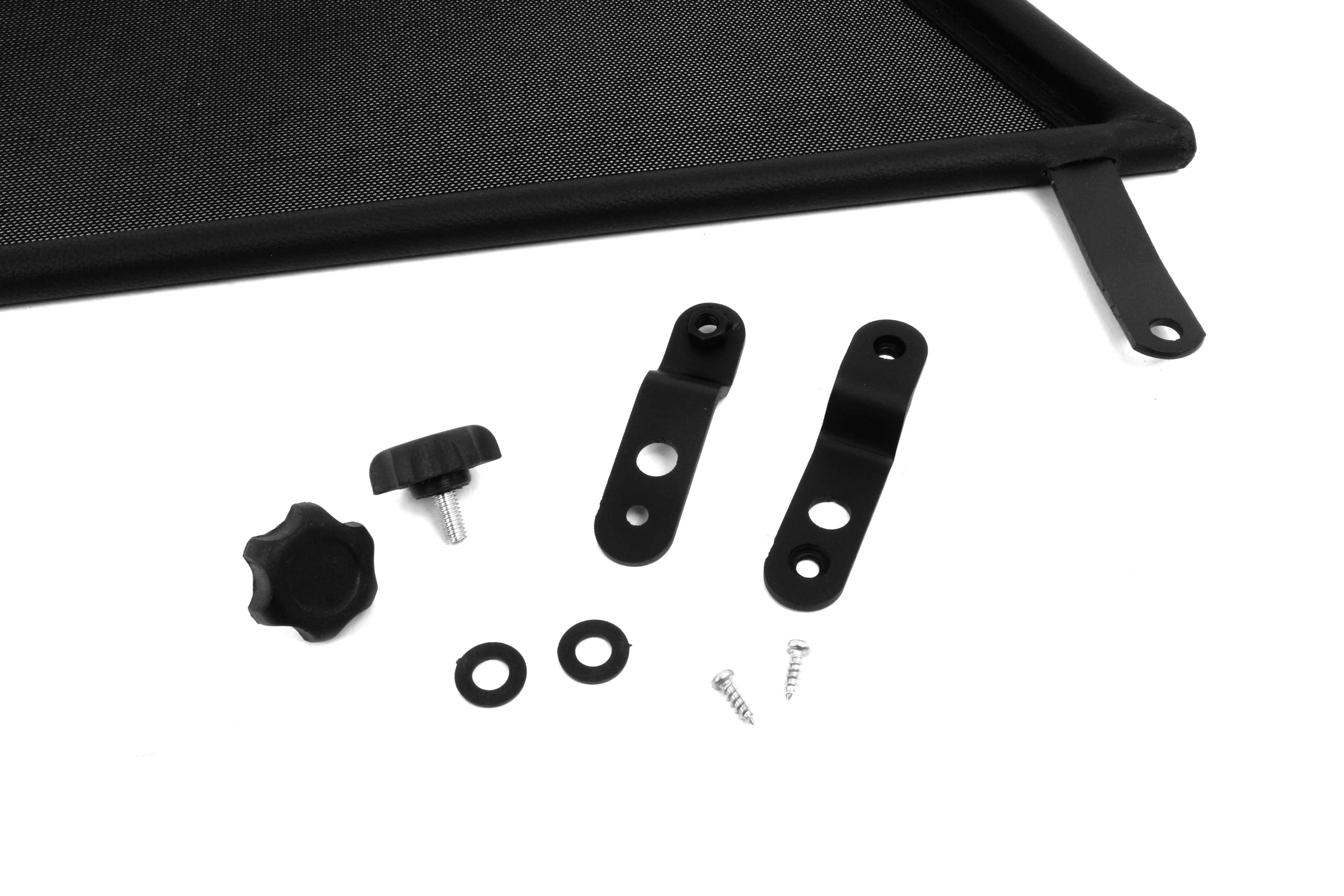 Wat doet een windscherm precies? Een windscherm in de eenvoudige versie is een stalen buisframe met net, gemonteerd achter de eigenlijke cabine, dat ervoor zorgt dat de gebruikelijke luchtwervelingen van een cabriolet worden omgeleid over het interieur van het voertuig. De frames van de windschermen zijn gemaakt van hoogwaardige stalen buizen, gebogen in de modelspecifieke dikte, netjes gelast en in weerbestendig kunstleer genaaid. Voor het netwerk gebruiken we een hoogwaardig nylon-polyester gemengd weefsel, dat zich onderscheidt door zijn hoge treksterkte en UV-bestendigheid. De net- of frameconstructie met de juiste bevestigingen en onderdelen, kan ook door een leek binnen enkele minuten worden gemonteerd.