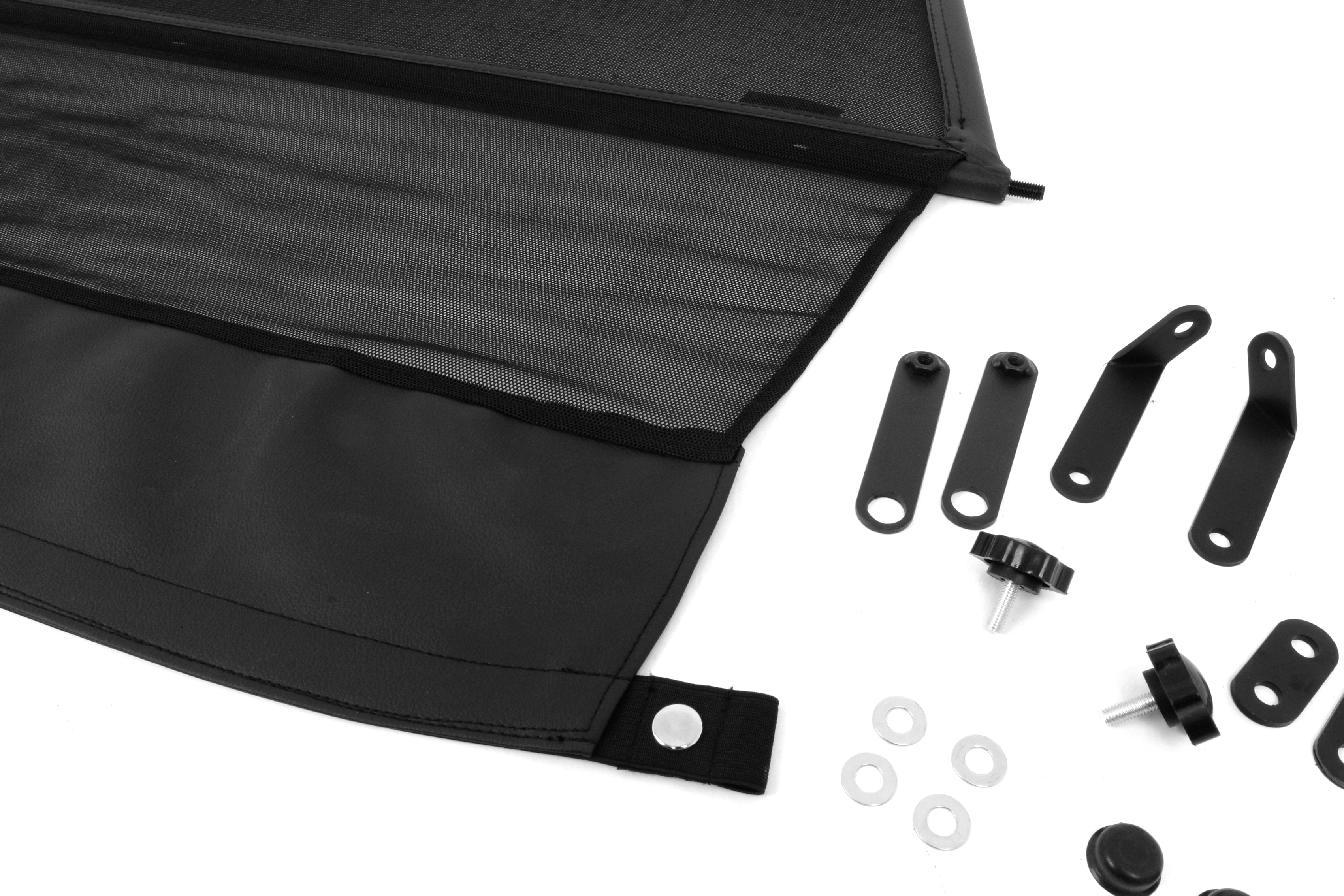 W prostej wersji osłona przeciwwiatrowa ma postać stalowej ramy rurowej z rozpiętą siatką, która po zamontowaniu za przedziałem kierowcy prowadzi strumienie powietrza nad wnętrzem pojazdu, redukując zawirowania powietrza występujące zwykle podczas jazdy kabrioletem. Ramy osłon przeciwwiatrowych wykonane są z wysokiej jakości rur stalowych o grubości dostosowanej do danego modelu, starannie zespawane i obszyte sztuczną skórą odporną na warunki atmosferyczne. Siatkę rozpinaną na ramie wytwarzamy z wysokiej jakości mieszanki nylonowo-poliestrowej, odznaczającej się wysoką sprężystością i odpornością na promieniowanie ultrafioletowe. Dzięki odpowiednim elementom montażowym i napinającym, z zamontowaniem konstrukcji ramowo-siatkowej nawet nieprofesjonalista poradzi sobie w ciągu kilku minut.