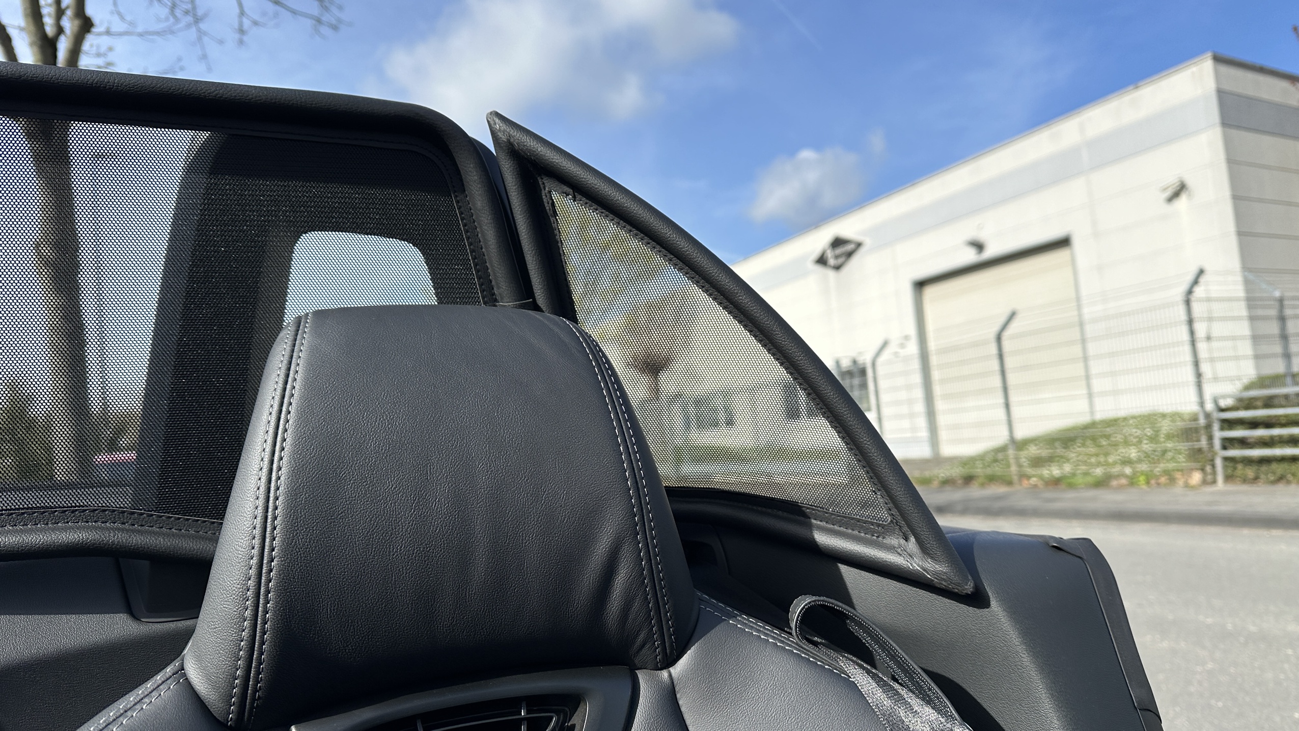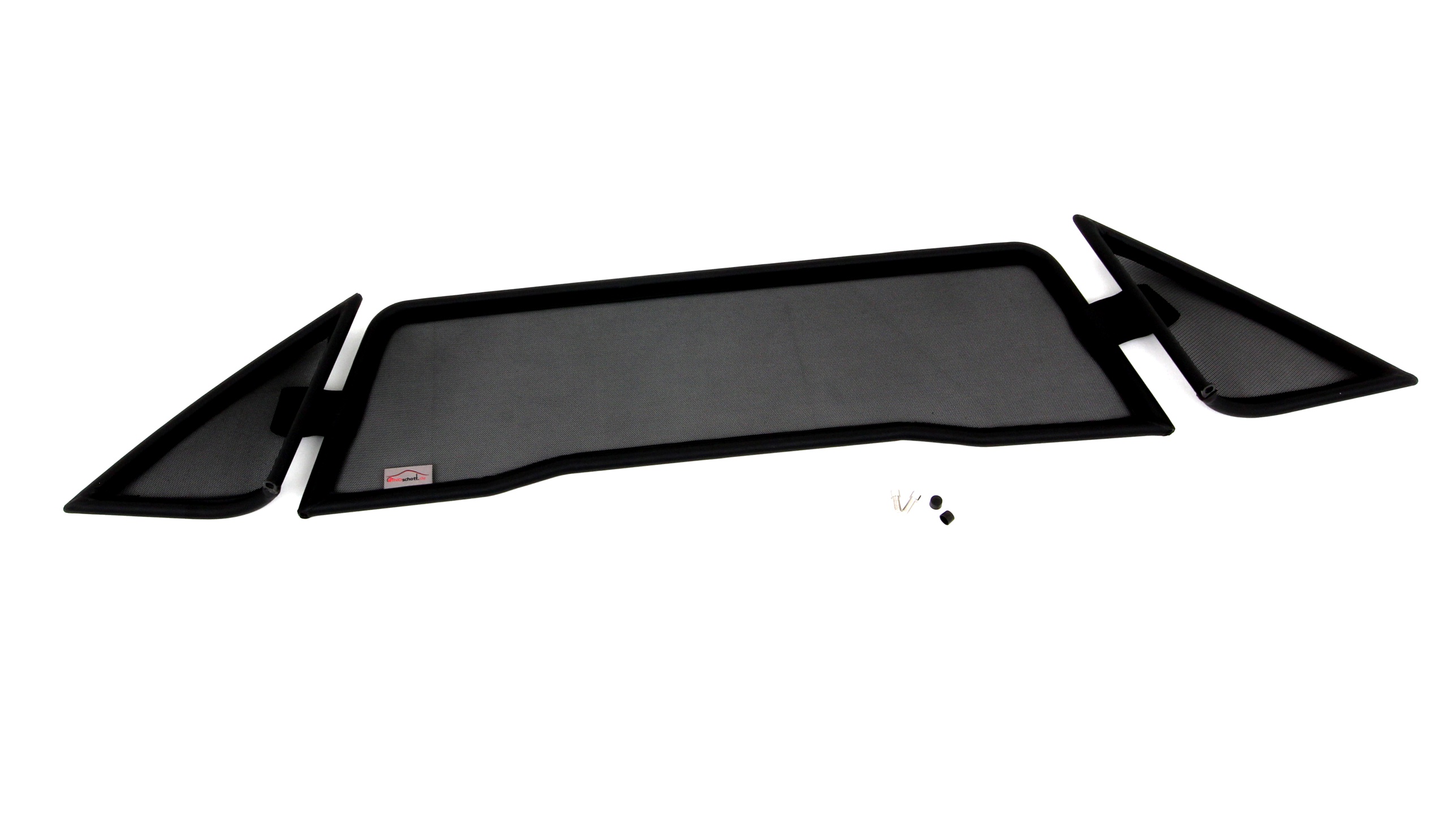 How does a wind deflector work?In its simplest form it is a mesh covered steel frame fixed behind the drivers seats, preventing the air swirling in the car every convertible driver knows. The deflector frames are made from high-grade steel tubes, bowed in car specific form and size, accurately welded and covered with weatherproof artificial leather with high-quality seams. A high-quality nylon-polyester blended fabric mesh is used as clothing, characterised by highest tensile strength and UV-resistance. Mesh, respectively frame systems can be mounted with the installation kits even by laymen within a few minutes!