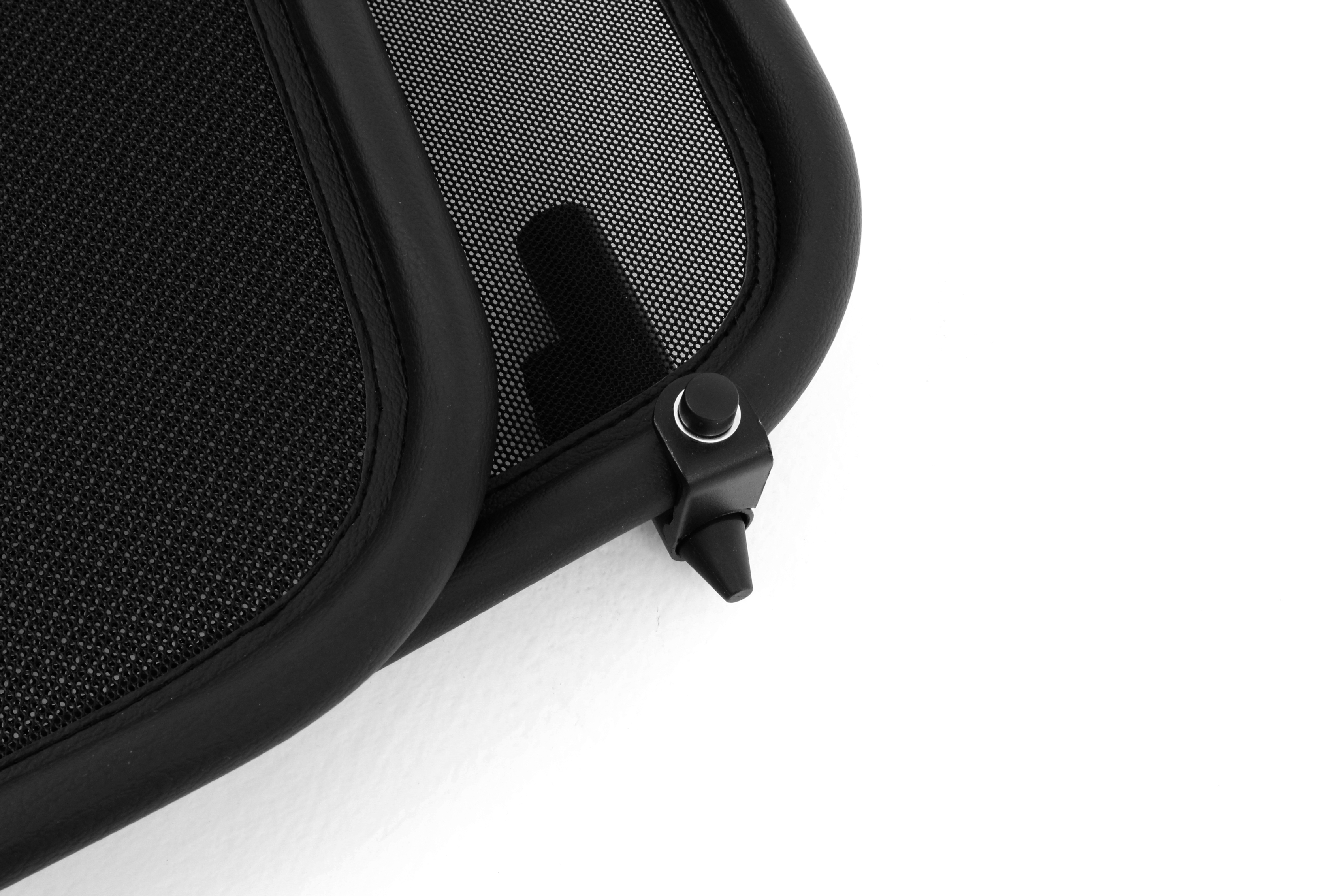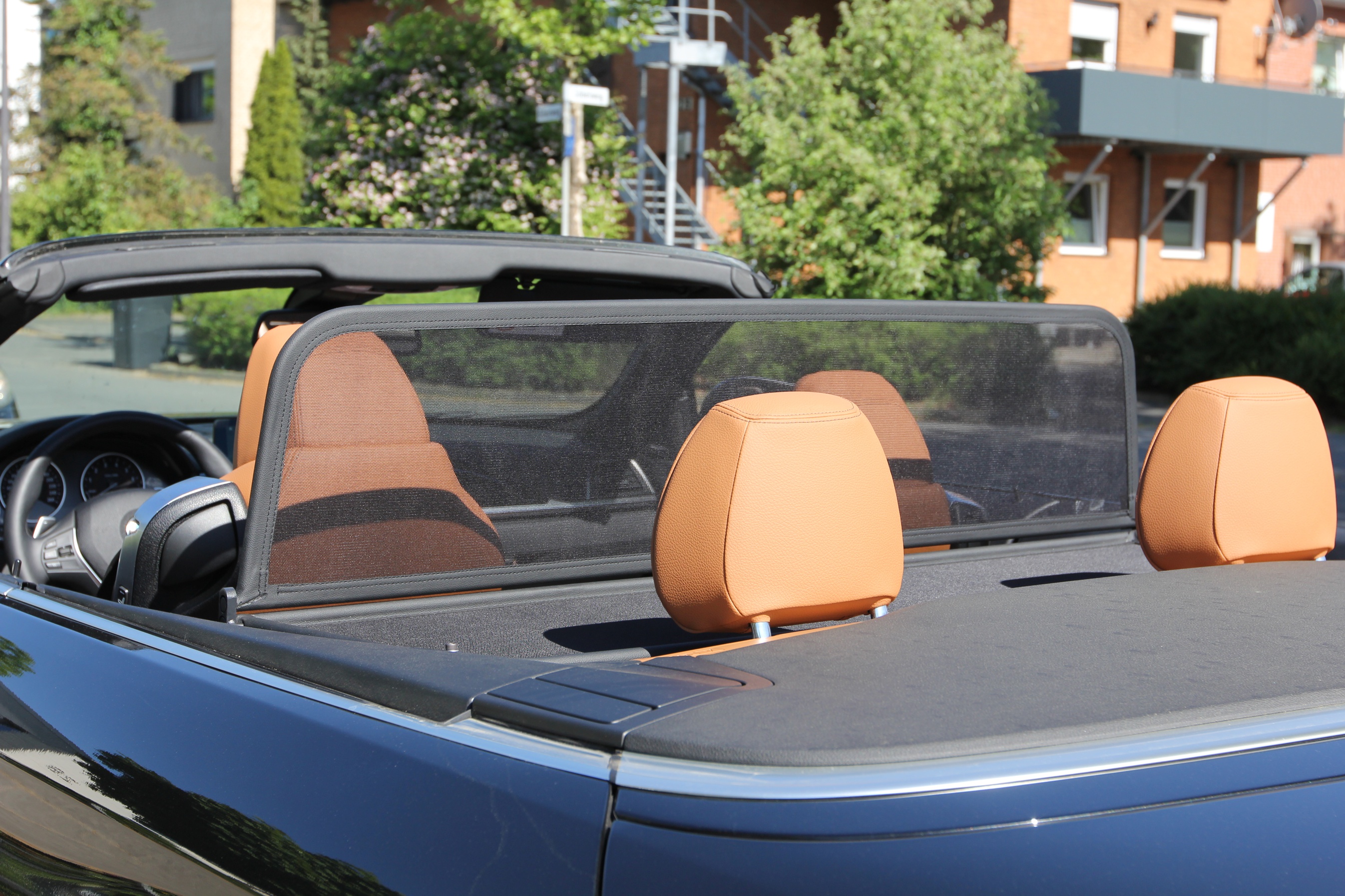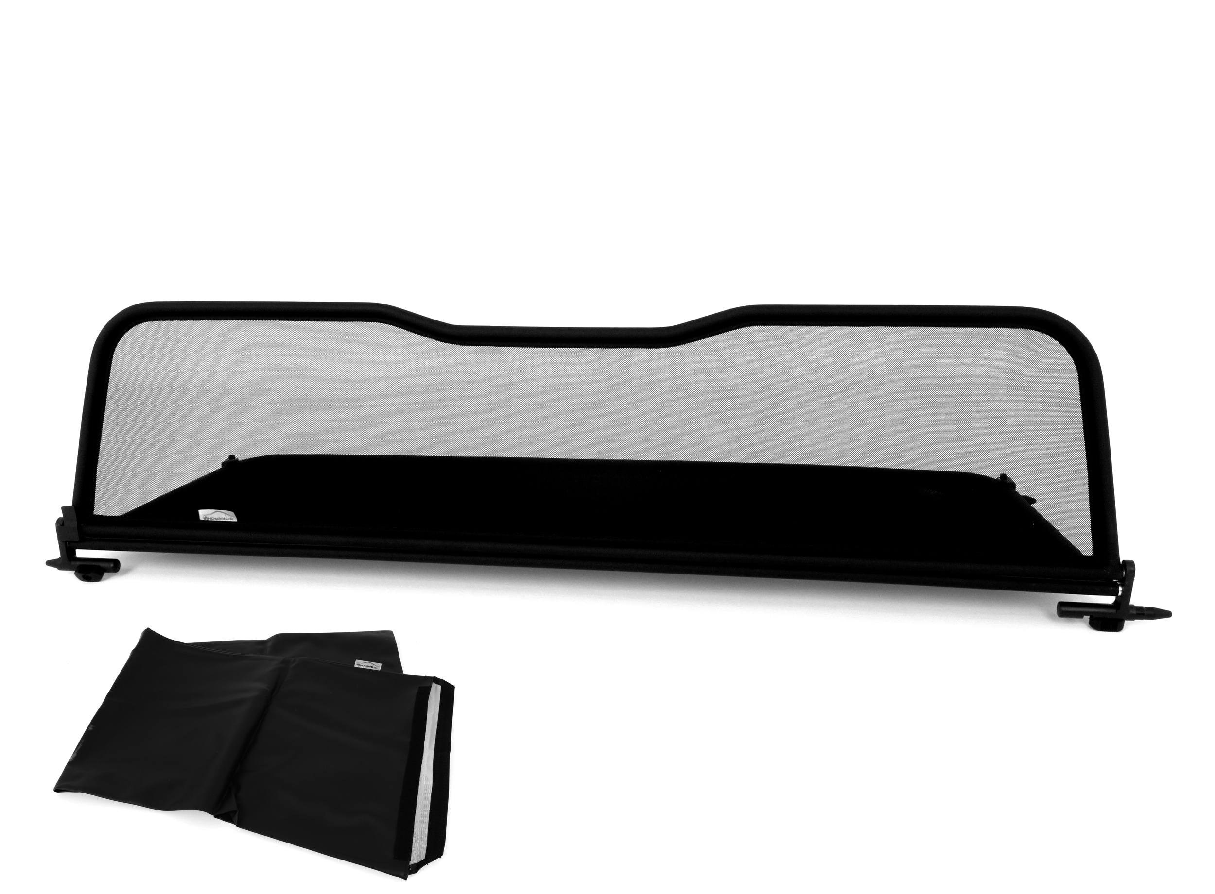 How does a wind deflector work?In its simplest form it is a mesh covered steel frame fixed behind the drivers seats, preventing the air swirling in the car every convertible driver knows. The deflector frames are made from high-grade steel tubes, bowed in car specific form and size, accurately welded and covered with weatherproof artificial leather with high-quality seams. A high-quality nylon-polyester blended fabric mesh is used as clothing, characterised by highest tensile strength and UV-resistance. Mesh, respectively frame systems can be mounted with the installation kits even by laymen within a few minutes!