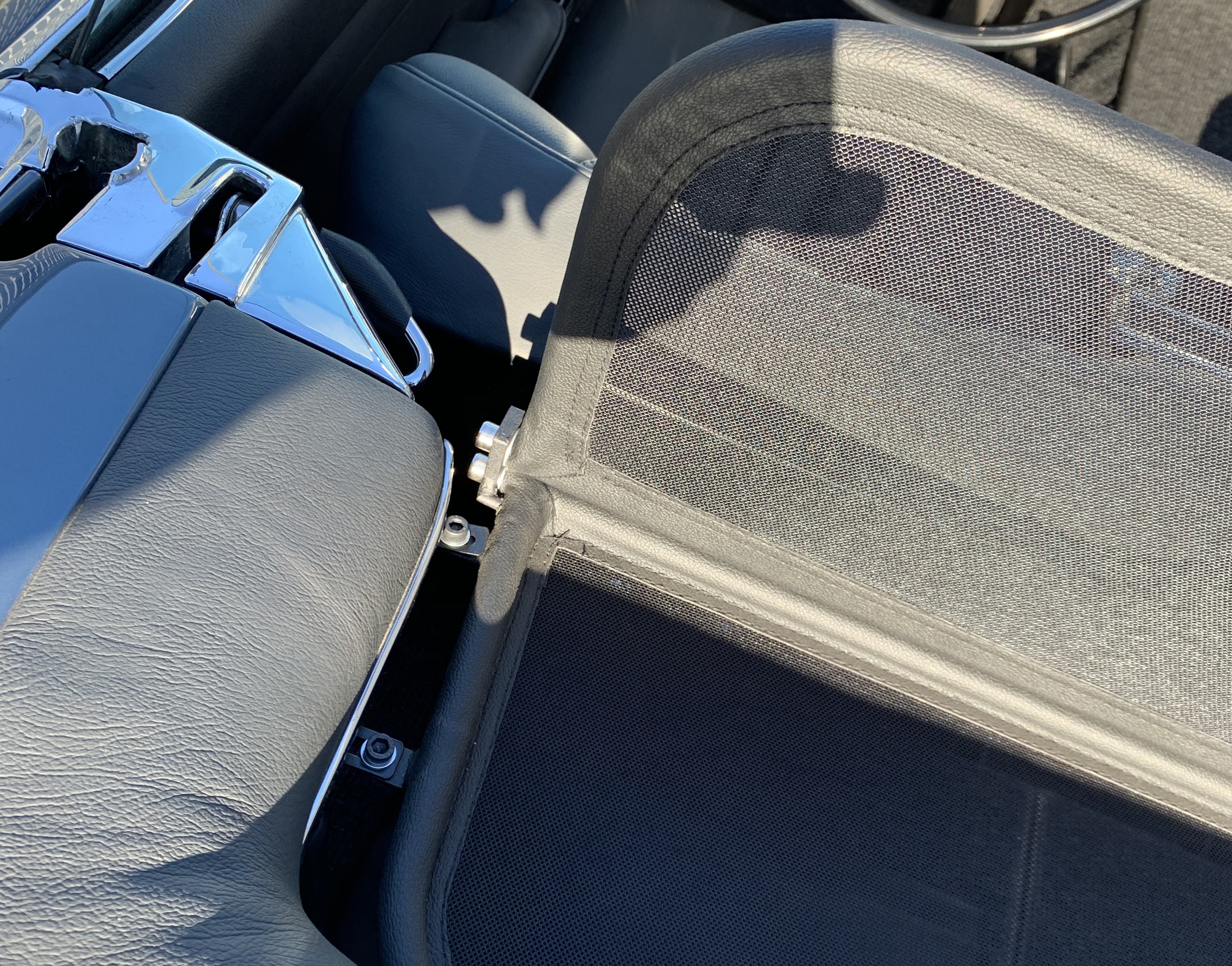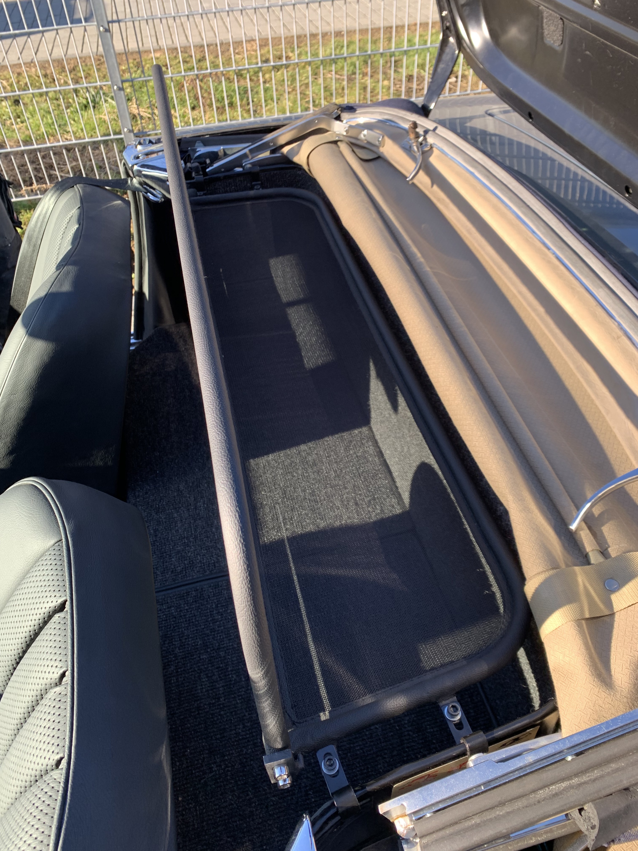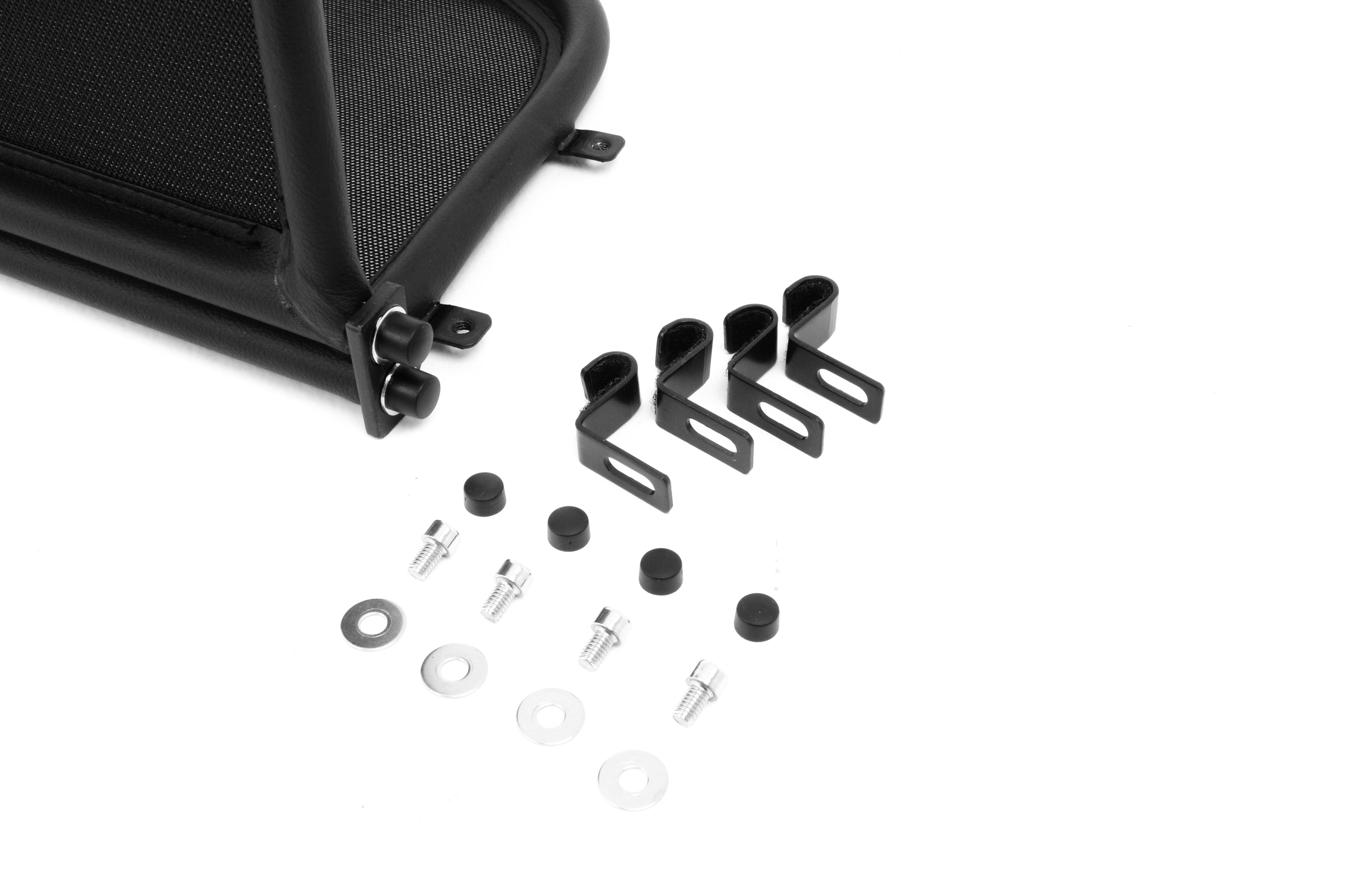 How does a wind deflector work?In its simplest form it is a mesh covered steel frame fixed behind the drivers seats, preventing the air swirling in the car every convertible driver knows. The deflector frames are made from high-grade steel tubes, bowed in car specific form and size, accurately welded and covered with weatherproof artificial leather with high-quality seams. A high-quality nylon-polyester blended fabric mesh is used as clothing, characterised by highest tensile strength and UV-resistance. Mesh, respectively frame systems can be mounted with the installation kits even by laymen within a few minutes!