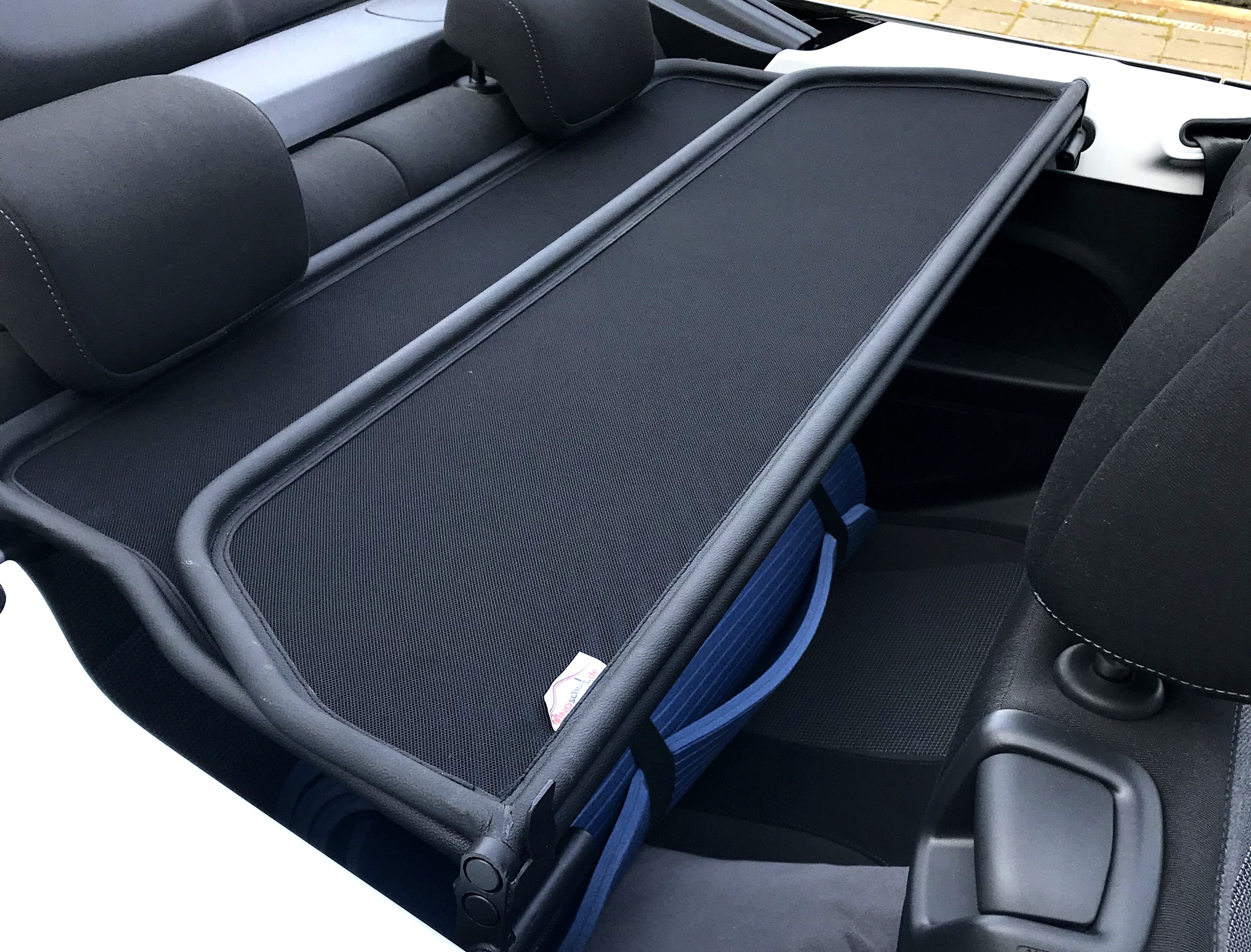 How does a wind deflector work?In its simplest form it is a mesh covered steel frame fixed behind the drivers seats, preventing the air swirling in the car every convertible driver knows. The deflector frames are made from high-grade steel tubes, bowed in car specific form and size, accurately welded and covered with weatherproof artificial leather with high-quality seams. A high-quality nylon-polyester blended fabric mesh is used as clothing, characterised by highest tensile strength and UV-resistance. Mesh, respectively frame systems can be mounted with the installation kits even by laymen within a few minutes!
