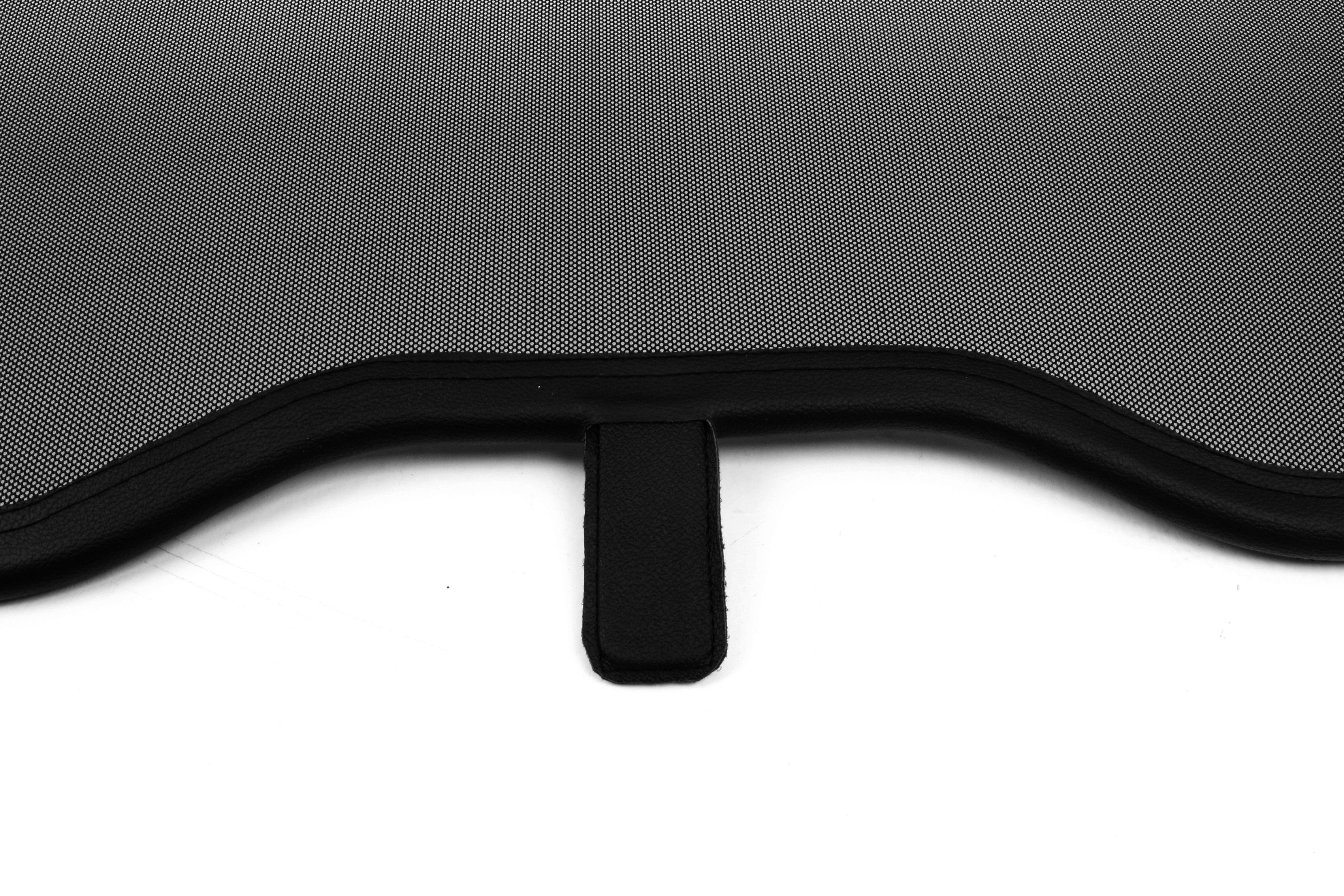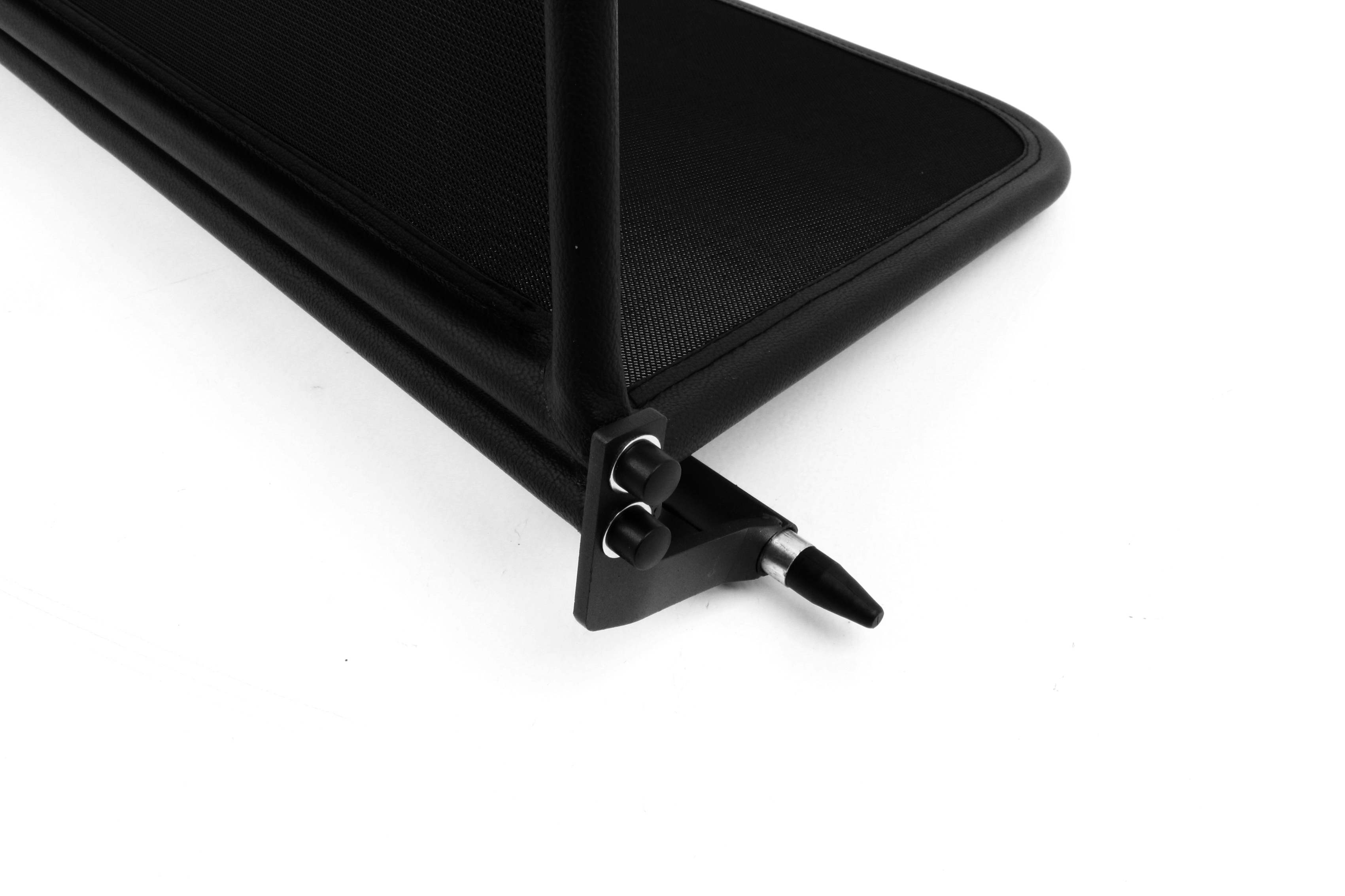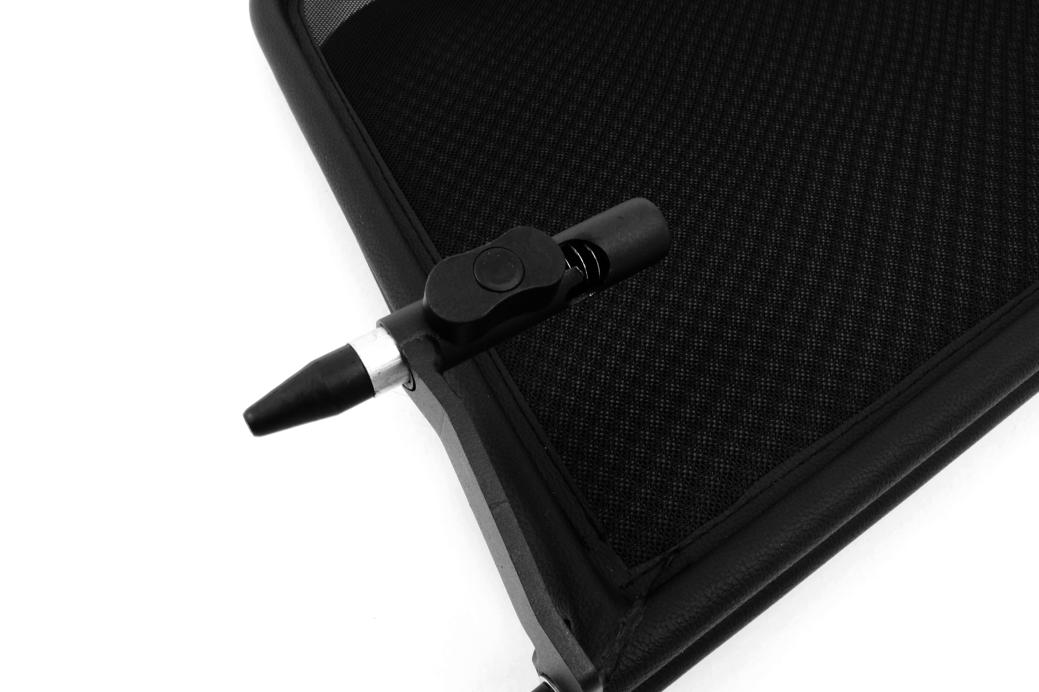 How does a wind deflector work?In its simplest form it is a mesh covered steel frame fixed behind the drivers seats, preventing the air swirling in the car every convertible driver knows. The deflector frames are made from high-grade steel tubes, bowed in car specific form and size, accurately welded and covered with weatherproof artificial leather with high-quality seams. A high-quality nylon-polyester blended fabric mesh is used as clothing, characterised by highest tensile strength and UV-resistance. Mesh, respectively frame systems can be mounted with the installation kits even by laymen within a few minutes!